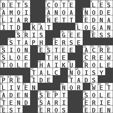 ACROSS 1. Stakes 5. ____ d'Azur (French Riviera) 9. French article 12. Mine, in Marseilles 13. Small Philippine buffalo 14. Connecting point 15. One who doesn't tell the truth 16. Remaining after all deductions 17. Pulitzer Prize-winning author Ferber 18. It would 19. Krazy ___ of comics 21. Utah city north of Ogden 22. Indian titles of respect 24. Turn to the right 26. Double-curved letter 27. Staphylococcus 28. Celtic language 29. The Jewish people; Israel 30. First name in cosmetics 32. 1/640 square mile 36. A type of plum 37. Definite Article 38. Group working together 39. Lacquered or enameled metalware 40. Japanese verse 42. Hero or heavy, e.g. 43. Baby powder 44. Annoyingly loud 46. Before (prefix) 49. Binary compound 50. Bits 51. Make or become more lively 53. Or not 54. Dripping 57. Arabian gulf 58. Back-to-school mo. 61. Flatfish 62. Be inclined (to) 63. Indian skirt 64. One of the Great Lakes 65. Eastern Standard Time (abbr.) 66. Greek god of love 67. Genesis locale DOWN 1. Indonesian resort city 2. Send forth 3. Inedible or poisonous agaric 4. Title for a knight 5. Patter 6. Single 7. Small child 8. Consume 9. Cabin 10. Ferber et al. 11. Actors Connery and Penn 14. Modern: prefix 19. Sleep 20. American tennis player Robert 21. Area sheltered from the wind 23. The wife of a rajah (variant) 24. Hellenic 25. Compass dir. 27. Grain storage tower 28. Value system 29. Fast jet (abbr.) 31. Having lost freshness 32. Sour-tasting 33. What you're doing now 34. Depend 35. She-sheep 40. Possessed 41. To (old English) 43. Metal container 45. Boat paddle 46. Food holder 47. Amusement-park features 48. Incident 52. Conclusion 53. Nuclear Threat Initiatives 55. Writer Wiesel 56. Adolescent 58. Compass dir. 59. Ewer handle 60. Adept person 61. Observe