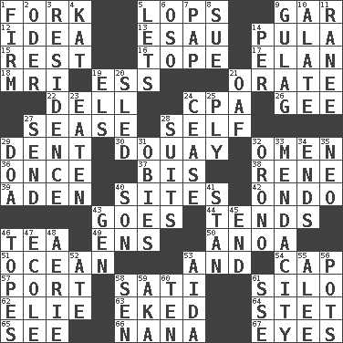 ACROSS 1. Tined utensil 5. Chops off 9. Slender fish 12. The main thing one is thinking about 13. He sold his birthright 14. Monetary unit of Botswana 15. Relief 16. Drink excessively 17. Enthusiasm 18. Medical imaging device (abbr.) 19. Curvy letter 21. Speak pompously 22. Small valley 24. Numbers guy (abbr.) 26. Turn to the right 27. Gospel singer Marvin 28. Oneself 29. Scratch 30. A city in N France, SE of Calais 32. Presage 36. Single time 37. Twice 38. French philosopher Descartes 39. Arabian gulf 40. Settings 42. Southwest Nigerian state 43. Moves 44. Looks after 46. Beverage made from leaves 49. Followers of ems 50. Small Philippine buffalo 51. Sea 53. Added to 54. Head covering 57. Left side of a ship or aircraft 58. Suttee (variant) 61. Grain storage tower 62. Writer Wiesel 63. Supplemented with great effort 64. Proofreading order 65. Perceive with the eye 66. Grandmother 67. Snake ____ (dice throw) DOWN 1. Unshakable 2. Baltic tributary 3. Home 4. Krazy ___ of comics 5. Allows 6. Bear (Spanish) 7. Infant food 8. Institute legal proceedings 9. POW camp 10. Having winglike extensions 11. Indian princess (variant) 14. For each 19. Raised railways 20. Downhill vehicle 21. Clumsy lout 23. Ingested 24. Stop 25. Travel a route regularly 27. Post 28. Sets or collections 29. ___ good deed 31. Off-Broadway awards 32. U. of Maine site 33. Ananias' fault 34. Conclusions 35. Modern: prefix 40. Manchild 41. Comedian Laurel of Laurel & Hardy 43. Commissioned mil. rank 45. Conclusion 46. Drinks excessively 47. Learning spot: Fr. 48. Nest on high 52. Had dinner 53. Opera by Verdi 55. Toward shelter 56. Cooking vessels 58. Elected rep. 59. Alias (abbr.) 60. "___ Little Indians" 61. Compass dir.