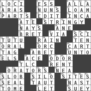 ACROSS 1. Event scenes 5. Double-curved letter 8. Silent film actress Nazimova 12. Caspian sea tributary 13. Religious women 15. Rich soil 16. Components 18. Prepare for publication 19. South American Indian 20. Had dinner 22. Slender, wiry 24. Negative votes 26. A saturated hydrocarbon 27. Cy Young winner Saberhagen 28. By way of 29. _-fi 32. Ballerina skirt 35. Water falling in drops from the sky 37. Nine, plus one 38. Taken by mouth 39. The grampus (Milton) 40. Haul 41. Label 42. Collude with 43. To (old English) 44. Raised railways 45. Adept person 46. Scent 49. Affectionate concern, for short 50. Monthly bill 51. Speakers 55. Teachers' org. 56. Oscar Madison type 57. Grain storage tower 59. Settings 63. Lick closed 64. Tense 65. Political cartoonist Thomas 66. Heavy book 67. Allow 68. Chop _ DOWN 1. Pet locale 2. Mouth or opening 3. Auto 4. Byzantium, centuries later 5. Compass dir. 6. Beer foam 7. In a ____ (agitated or irritated) 8. Place in a line 9. Yearn 10. Made of lace 11. Nursemaid (var.) 14. Put through a sieve 17. Play the lead 21. Sight organ 23. _ tizzy (2 wds.) 25. Disco prop 28. Winning man's name 29. Comedian Laurel of Laurel & Hardy 30. Certainty 31. To the inside or interior of 32. Lug 33. Mountain range 34. Labels 36. "We ___ not amused" (Victoria) 40. Window treatments 42. Buttonhole 45. Keyboard modifier key 47. Lair 48. Singles 49. Eating place 51. Margarine 52. Wander 53. Monetary unit of Yemen 54. Turn sharply 56. Fast jet (abbr.) 58. Baseball player Mel 60. The 19th letter of the Greek alphabet 61. Compass dir. 62. Filthy place