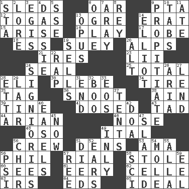 ACROSS 1. Bobsleighs 6. Rowing implement 9. Parent Teacher Assoc. 12. Ancient Roman robes 13. Legendary monster 14. Part of Q.E.F. 15. Originate 16. Shaw product 17. Ear part 18. Curvy letter 19. Chop _ 20. High mountains 21. Angers 23. Cards in a Roman deck? 24. Lick closed 25. Add up to 28. Connecticut Ivy Leaguer 30. Military trainee 34. Hoop that covers a wheel 35. Label 36. Snout, nose 38. The 18th letter of the Arabic alphabet 39. Prong on a fork 41. Administered medicine 43. Small boy 44. Believer in; advocate of (suffix) 46. Olfactory organ 48. Bear (Spanish) 49. Slanted text style (abbr.) 50. Group working together 51. Hiding places for outlaws 53. Nanny (var.) 56. Silvers or Donahue 57. Monetary unit of Yemen 58. Fur scarf 60. Observes 61. Suggestive of the supernatural 62. Cell (Danish) 63. Big collection agency 64. Begley and Asner 65. Perfect DOWN 1. R.R. building 2. Old wives' tales, e.g. 3. The front part of a cuirass 4. Small ungulate mammals of Africa 5. Compass dir. 6. Stare 7. Like ___ of sunshine 8. Marina Del _, California 9. Appease 10. Bar bills 11. Had dinner 13. Musical composition 14. American author Paul (1891-1958) 19. Makes a sale 20. Keyboard modifier key 22. Hit sharply and swiftly 24. Seigniories (variant) 26. Operatic vocal solo 27. Grant temporary use of 28. Singer James 29. Den 31. Conclusion 32. Sometimes accompanies a hiss 33. Greek goddess of the dawn 37. Portable shelters 40. Artist's stands 42. ___ good deed 45. At this time 47. Scheduled 49. In an inward manner 50. "Mermaids" star 51. Passed on 52. Hearing organs 54. Undercover agent 55. Silent film actress Nazimova 56. Air pressure measure (abbr.) 57. To sift 58. _-fi 59. Snakelike fish