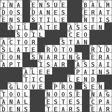 ACROSS 1. _ tizzy (2 wds.) 4. Follow as a consequence or result 9. Lip ointment 13. Two (Sp.) 14. Natives or inhabitants of Denmark 15. Part of Q.E.F. 16. Followers of ems 17. Vertical member of a panel or frame 18. Nuclear Threat Initiatives 19. Petroleum 21. Had dinner 22. NE Netherlands city 24. Land 26. Corporate head (abbr.) 27. Thespian 29. Comedian Laurel of Laurel & Hardy 30. Schedule 31. Printing process, for short 33. To free from 36. A really long time 37. Catching in a trap 40. Epoch 41. Fitting 42. Austrian river, tributary to the Danube 43. Slender Brazilian palm 45. Toward shelter 47. Aches 48. Nervous spasm 49. Grant temporary use of 50. Michael Jackson trademark 52. Adept person 54. Elected rep. 56. Utensil 57. Trap for birds or small mammals 59. Tired old horse 61. Of or related to the anus 62. _____ Park, CO 63. Accounting whiz (abbr.) 64. Cub Scout units 65. Rends 66. Ewer handle DOWN 1. Binary compound 2. Words to Nanette 3. Helper 4. Begley and Asner 5. Relating to or accompanying birth 6. In a ____ (agitated or irritated) 7. Ubangi River tributary 8. Compass dir. 9. Gillaume's butler role 10. Johnson of "Laugh-In" 11. (Had) reclined 12. Mountains (abbr.) 20. Spoils 22. NE Massachussets city 23. Ocean 25. Angers 27. Toward the sea 28. Hoof sound 29. Disorderly outburst 31. Raze (variant) 32. Mouth or opening 33. Home 34. SW Asia republic 35. Raised platform 38. Sibling's daughter 39. Open wide 44. Without 45. Ringlike coral islands and reefs 46. 54 in ancient Rome 49. Failure 50. Went 51. Grant temporary use of 52. Introduce or present, as a question 53. Round or rotation of duties 55. California wine valley 56. Small amount or degree 57. Fish or hair follower 58. Double-curved letter 60. Slender fish