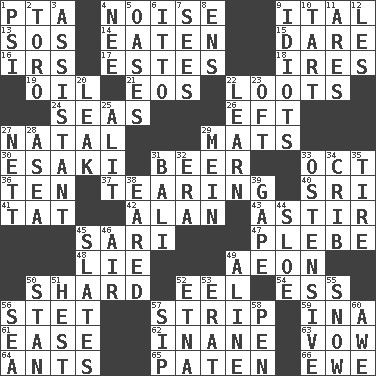 ACROSS 1. Parent Teacher Assoc. 4. Annoying sound 9. Slanted text style (abbr.) 13. Mayday 14. Consumed 15. Have the gumption 16. Big collection agency 17. _____ Park, CO 18. Angers 19. Petroleum 21. Greek goddess of the dawn 22. Plunders 24. Oceans 26. Bank Draft (abbr.) 27. Relating to or accompanying birth 29. Floor coverings 30. 1973 Nobel Price Winner (Physics) Leo 31. Fermented drink made from hops 33. Sep. follower 36. "___ Little Indians" 37. Lacerating 40. _ Lanka 41. Make lace 42. Actor Alda or Thicke 43. Moving or stirring 45. Indian skirt 47. Military trainee 48. Untruth 49. Age 50. Broken piece 52. Snakelike fish 54. Curvy letter 56. Proofreading order 57. Empty completely 59. _ tizzy (2 wds.) 61. Relaxation 62. Lacking in sense or substance 63. Promise 64. Pismires 65. Eucharist need 66. She-sheep DOWN 1. 23rd letter of the Greek alphabet 2. "Corrida" creature 3. Helper 4. Born 5. Fertile tracts in a desert 6. "Tell ____ the Marines!" 7. Perceives with the eye 8. Followers of ems 9. Foolish or stupid persons 10. Small pie 11. Ancient Greek god of war 12. French article 20. Path through which fluid escapes 22. Acquire or gain knowledge or skills 23. Often (poetically) 25. Set down 27. Remaining after all deductions 28. At sea 29. Chow _ 31. Indonesian resort city 32. Epoch 33. Clearly or manifestly demonstrative 34. Baby bed with high sides 35. Hoop that covers a wheel 38. Having ears or earlike features 39. Open wide 44. A type of plum 45. Chalkboards 46. Wind 49. Place in a line 50. Comedian Laurel of Laurel & Hardy 51. Behest 52. Inactive volcano in Sicily 53. Part of Q.E.F. 55. Frozen precipitation 56. Ocean 57. Small drink 58. Fenced enclosure 60. Deep reverence
