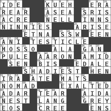 ACROSS 1. Binary compound 4. Malaysian steamed pastry 8. Epoch 11. Posterior 13. Toward the sea 14. Indian titles of respect 15. Land measure 16. 1994 drama film starring Jodie Foster 17. Taverns 18. Simpletons 21. Originate 22. Inactive volcano in Sicily 23. Compass dir. 25. Car or cant ending 26. Black tropical American cuckoo 29. One of the two male reproductive glands 32. With motion or animation 34. Insect wing 35. Separate the seeds from cotton 38. Whimper 39. Composer Copland 41. Among 43. Elected rep. 44. Twice 45. Peak District village in England 46. Most dark, concealed or hidden 50. Layer 51. Lyricist Gershwin 54. Had dinner 55. Floor coverings 57. Roamer 59. Honored 63. The sixth month of the Jewish calendar 64. Pull into pieces 67. Opera by Verdi 68. Egg locale 69. Long (Scottish) 70. Jennifer or Joel 71. Greek goddess of the dawn 72. Algonquian 73. Followers of ems DOWN 1. SW Asia republic 2. Tenth: prefix 3. Merit 4. Sunflower state 5. Purpose 6. Snakelike fish 7. Actor Linden 8. Bert's buddy 9. Remove soap 10. NE Netherlands city 12. French philosopher Descartes 14. Title for a knight 19. "Tell ____ the Marines!" 20. Compass dir. 21. Leather borer 23. Grain storage tower 24. Examine minutely or intensely 26. Electrical Unit 27. Common sense 28. Capri or Wight 30. Tarsus (plural) 31. Mild oath 33. Elected reps. 36. Nursemaid 37. The longest river in the world 39. Blind as ____ 40. Assistant 42. Lair 45. Singer James 47. Possessed 48. Develop 49. Saxophone 51. Silly 52. Cowboy competition 53. Collect or gather 56. Volcanic refuse 58. Tate display 60. Become fatigued 61. Genesis locale 62. 24-hour periods 64. Affectionate concern, for short 65. Hearing organ 66. A saturated hydrocarbon