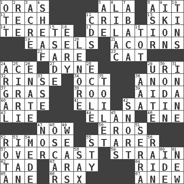 ACROSS 1. Mouths or openings 5. Chicken ___ king 8. Small island 11. Technology 12. Baby bed with high sides 13. What Jean-Claude Killy likes to do 14. Cylindrical with tapered ends 17. Accusation by an informer 19. Artist's stands 21. Oak nuts 22. Conductor's collection 23. Feline 24. Adept person 27. Centimeter-gram-second unit of force 29. RI univ. 32. Wash lightly 34. Sep. follower 36. Soon (poet.) 37. Pate de foie ____ 38. Friend of Pooh 39. Opera by Verdi 40. Johnson of "Laugh-In" 41. Connecticut Ivy Leaguer 42. Smooth fabric 43. Falsehood 44. Liveliness 46. Compass dir. 47. Immediately 50. Greek god of love 52. Full of chinks, cracks, or crevices 55. A viewer who gazes fixedly 57. Cloudy 59. Put through a sieve 62. Small boy 63. Like ___ of sunshine 64. Travel on an animal 65. A saturated hydrocarbon 66. Acura sports coupe 67. Afresh DOWN 1. Baseball player Mel 2. To separate or throw off 3. 43,560 square feet 4. To gather and bind into a bundle 5. "We ___ not amused" (Victoria) 6. Pale purple color 7. Phillipine bananalike plant 8. SW Saudi Arabia district 9. Picture 10. Metal containers 12. Music discs 15. Sadhe (variant) 16. Suggestive of the supernatural 18. Small child 20. Poe poem 24. Therefore, facetiously 25. High-altitude cloud 26. Maternal 28. Learning spot: Fr. 29. Join together 30. "The Thinker" sculptor 31. Empty; void 33. Compass dir. 35. Bathroom plumbing fixture 36. American Automobile Association (abbr.) 42. Derisive sound 45. Caspian sea tributary 47. Not either 48. Witty Wilde 49. Puts on (as clothing) 51. Father Junipero _ 52. Round or rotation of duties 53. "Terrible" tsar 54. Ancient Persian 55. Filthy place 56. Precipitation 58. Saxophone 60. Binary compound 61. ___ Haven, CT