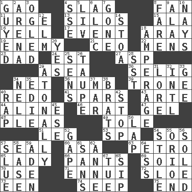 ACROSS 1. E Mali city 4. Volcanic refuse 8. Avid follower 11. Goad 13. Grain storage towers 15. Wing 16. Shout 17. Happening 18. Like ___ of sunshine 19. Foe 21. Corporate head (abbr.) 22. Not women's 23. Male parent 24. Eastern Standard Time (abbr.) 27. Viper 29. Toward the sea 30. Former Milwaukee Brewers owner Bud 34. Fish or hair follower 36. Unfeeling 39. Heavy duty weighing machine 40. Redecorate 41. Practice fights 43. Johnson of "Laugh-In" 44. Place in a line 46. Part of Q.E.F. 47. Set 48. Entreaties 49. Lacquered or enameled metalware 51. Part of a journey 53. Health resort 54. Mayday 57. Lick closed 60. White ___ sheet 63. Stone: prefix 65. Kenny Rogers chart-topper in '80 66. Leg coverings 69. Land 70. Purpose 71. World-weariness 72. A type of plum 73. Car or cant ending 74. Ooze 75. Conclude DOWN 1. Steadied 2. Sports stadium 3. Stared 4. Compass dir. 5. 54 in ancient Rome 6. Actor Baldwin 7. Went 8. Conductor's collection 9. Actor Alda or Thicke 10. Negative votes 12. Shade tree 14. Portico 18. Electrical Measurement 20. It is so 25. Elected reps. 26. Grayish beige 28. Fast jet (abbr.) 29. Lacking a tonal center or key 31. Old wives' tales, e.g. 32. International (abbr.) 33. Unit of force equal to gravity 34. 1994 drama film starring Jodie Foster 35. Singer Brickell 37. Spoil 38. Naughty children 40. Hit sharply and swiftly 42. Discontinue 45. Compass dir. 50. Pet locale 52. Open wide 54. Fur scarf 55. Constellation of myth 56. Having a sole or soles 57. Turn sharply 58. Comfort 59. Arabian gulf 61. Without 62. Singer Murray 64. Double-curved letter 67. Third day of the wk. 68. Small drink