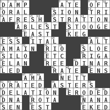 ACROSS 1. Moist 5. Had dinner 8. Often (poetically) 11. Spoken 12. The Jewish people; Israel 13. Three (prefix) 14. Anew 17. Ski resort town in Vermont 19. Most capable 21. Moe Howard, for one 22. Compass direction 23. Cask 24. Double-curved letter 27. Slanted text style (abbr.) 29. Keyboard modifier key 32. At full speed 34. _ de Janeiro 36. A type of plum 37. Grain storage tower 38. And so on (abbr.) 39. Port city in Latvia 40. Flair 41. Portuguese money of account (variant) 42. Middle Eastern gold or silver currency 43. Directed 44. Assign a rank or rating to 46. Followers of ems 47. Nanny (var.) 50. Remaining after all deductions 52. Declaimed 55. Michaelmas daisies 57. Accusation by an informer 59. Worn away 62. Heredity factor (abbr.) 63. Roll call or roster of names 64. Grandmother 65. Elected rep. 66. Eastern Standard Time (abbr.) 67. Made supply last DOWN 1. ___ good deed 2. Sandy's bark 3. Hindu Mythology: god of death 4. First-year military academy student 5. Small island 6. Cod relative 7. Related on the mother's side 8. Von Bismarck 9. Tree-dwelling hopper 10. Prong on a fork 12. Fast jet (abbr.) 15. Killed 16. Behest 18. Coat; cloak 20. A viewer who gazes fixedly 24. Artist's stand 25. Grin 26. First course 28. 61 cubic inches 29. Place in a line 30. Utah city north of Ogden 31. Lacerates 33. Electrically charged atom 35. Seas 36. Indian title of respect (Mr.) 42. Prevent from occurring 45. Wig 47. _ moment's notice (2 wds.) 48. Distance measurement (Brit.) 49. Goodbye (Sp.) 51. Marketplace scale 52. Likelihood 53. French philosopher Descartes 54. ____ Jay Lerner 55. Santa ___, CA 56. Neighbor of Neb. 58. Baseball player Mel 60. Compass dir. 61. June honoree