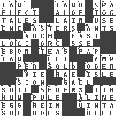 ACROSS 1. "Change" in Tahitian 5. Hyperbolic tangent 9. Health resort 12. Choose 14. Medicinal plant 15. Coat; cloak 16. Stories 17. (Had) reclined 18. Purpose 19. Compass dir. 20. Michaelmas daisies 23. Pismires 24. Bowlike part 25. 90 degrees 27. Venues 30. The grampus (Milton) 32. Compass dir. 33. Inky black, to poets 34. Beverages made from leaves 36. Infant food 38. The 19th letter of the Greek alphabet 39. Biblical high priest 40. Electrical Unit 43. For each 46. Disposed of to a purchaser 48. River in Europe 49. Compete 51. Actress Charlotte 52. Capri or Wight 53. The Jewish people; Israel 54. Highlander 56. The visible part of the earth's surface 58. Spring feasts 61. Shallow baking pan 64. Attila the _ 65. Whimper 66. Place in a line 68. Ovum 69. It's straight from the horse's mouth 70. National forest in Provo, Utah 71. A female animal or person 72. Lyric poems 73. Small valley DOWN 1. Wig 2. Actor Alda or Thicke 3. Ubangi River tributary 4. Frozen water 5. Lie 6. Having or resembling wings 7. Annoying sounds 8. Layer 9. Difficult or unusual or dangerous feat 10. Mail 11. Matures 13. Russian ruler of old 21. Native of Scotland 22. Threesomes 23. Toward the sea 24. The 18th letter of the Arabic alphabet 26. Viper 27. Allow 28. Chief or king in Benin or Nigeria 29. Clever action or accomplishment 31. Bodily heat indicating an inflammation 35. Fodder prepared in a silo 37. Writing tablets 41. Cartoonist voice _ Blanc 42. Before (prefix) 44. Tending to cause great harm 45. River (Sp.) 47. Letter starter 48. Petroleum 50. Took place subsequently 53. Scorch 55. Son of Isaac 56. "______ My Girl" (Turtles hit) 57. Ending for "Through" and "Enough" 59. Writer Wiesel 60. Habitations of wild animals 61. Prong on a fork 62. International (abbr.) 63. Anneal 65. Adept person 67. Hat (slang)