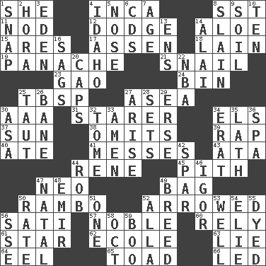 ACROSS 1. A female animal or person 4. South American Indian 8. Fast jet (abbr.) 11. Lower and raise head in agreement 12. Evade 14. Medicinal plant 15. Ancient Greek god of war 17. NE Netherlands city 18. (Had) reclined 19. Flamboyance 21. Slow-paced one 23. E Mali city 24. Storage container 25. Cook's measure (abbr.) 27. Toward the sea 30. Auto club (abbr.) 31. A viewer who gazes fixedly 34. Raised railways 37. Player for Phoenix 38. Leaves out 39. Reproach for some lapse or misdeed 40. Had dinner 41. Makes clutter 43. _ moment's notice (2 wds.) 44. French philosopher Descartes 45. Heart or essence 47. Modern: prefix 49. Container for groceries 50. Role for Stallone 52. Moved like an arrow 56. Suttee (variant) 57. Impressive in appearance 60. Have confidence or faith in 61. Play the lead 62. Learning spot: Fr. 63. Whopper 64. Snakelike fish 65. Frog relative 66. Directed DOWN 1. Fastener 2. Israeli folk dance 3. Locale of original sin 4. Potato state 5. Sense of smell 6. Music discs 7. Mature 8. Killed 9. Earth 10. "___ Little Indians" 13. Followers of ems 14. Jai ____ 16. Sinks 20. Smile enhancers 22. Basketball assoc. 25. Strained 26. Object of repulsion 27. Ascend 28. Arranges properly for use 29. Celtic language 30. White ___ sheet 32. Heavy book 33. So be it 34. Part of Q.E.F. 35. Thin strip of wood or metal 36. Health resort 42. Practice fight 44. Director Reiner 46. Composer Stravinsky 47. Relating to or accompanying birth 48. Arab leader 49. A special lineage 50. Assign a rank or rating to 51. Single 52. Silent film actress Nazimova 53. Water source 54. Writer Wiesel 55. Colored 56. Compass dir. 58. Sep. follower 59. Sometimes accompanies a hiss