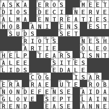 ACROSS 1. "____ silly question..." 5. Greek god of love 9. Rendezvous 13. "Vaya con ____" 14. Tenth: prefix 15. Impudent aggressiveness 16. _ mater 17. Pleas 19. Disorderly crowd 20. Cuckoo 21. Followers of ems 22. Eastern Standard Time (abbr.) 23. Soap bubbles 25. Put into a specified state 26. Disturbances 30. Soft 34. Nick name for Arthur 35. Margarine 36. Aid 39. Pulls apart 42. Is not 43. Toward shelter 44. Settings 46. Flaplike coverings 47. Peak District village in England 48. Gear tooth 51. Austrian river, tributary to the Danube 54. Epoch 57. Actress Charlotte 58. Shoshoni 60. Director Reiner 62. Unrelated to defense, as in spending 65. Opera by Verdi 66. Michael Jackson trademark 67. Back-to-school mo. 68. (Had) reclined 69. Tear apart 70. Relaxation 71. Queen of England 1702-14 DOWN 1. First of billions? 2. Grain storage towers 3. Dried seaweed eaten as food 4. White ___ sheet 5. Genesis locale 6. Painter Guido (1575-1642) 7. Sep. follower 8. Male parents of animals 9. Was introduced to 10. One of the Great Lakes 11. Nights before holidays 12. Trial 15. Political cartoonist Thomas 18. Compass dir. 20. SW Saudi Arabia district 24. Window treatments 27. Baseball player Mel 28. Standoff 29. Gospel singer Marvin 30. Annoying sounds 31. Raised railways 32. Elected rep. 33. Being at a high temperature 36. Actor Linden 37. Connecticut Ivy Leaguer 38. Directed 40. To free from 41. R.R. building 45. Writer Wiesel 48. Algonquian 49. Clumsy lout 50. Honkers 52. Believer in; advocate of (suffix) 53. "The Thinker" sculptor 54. Engineer (abbr.) 55. Hero or heavy, e.g. 56. Soon (poet.) 58. United States Postal Service (abbr.) 59. False hair 61. Object of repulsion 63. Movie disc 64. Teachers' org. 65. Insect wing