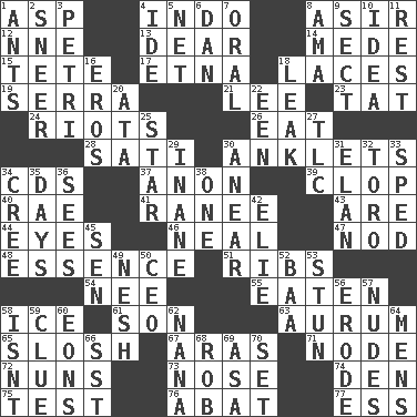 ACROSS 1. Viper 4. _ china 8. SW Saudi Arabia district 12. Compass dir. 13. Letter starter 14. Ancient Persian 15. False hair 17. Inactive volcano in Sicily 18. Shoestrings 19. Spanish missionary in California 21. Area sheltered from the wind 23. Make lace 24. Disturbances 26. Ingest 28. Suttee (variant) 30. Short socks 34. Music discs 37. At once, immediately (arch.) 39. Hoof sound 40. Actress Charlotte 41. Indian princess (variant) 43. "We ___ not amused" (Victoria) 44. Snake ____ (dice throw) 46. Be tempered by heat 47. Lower and raise head in agreement 48. Substance 51. Teases 54. Born 55. Ingested 58. Frozen water 61. Manchild 63. Gold (Symbol: Au) 65. Splash clumsily 67. Caspian sea tributary 71. Connecting point 72. Religious women 73. Olfactory organ 74. Lair 75. Trial 76. Blind as ____ 77. Curvy letter DOWN 1. Pismires 2. Scornful expression 3. _ dish (used to culture cells) 4. Binary compound 5. Fish or hair follower 6. Daniel's nick name 7. Taken by mouth 8. Nursemaid (var.) 9. Religious group 10. The main thing one is thinking about 11. Relief 16. Greek god of love 18. Path through which fluid escapes 20. _ moment's notice (2 wds.) 22. Car or cant ending 25. Play the lead 27. Affectionate concern, for short 29. Silly 30. Approach 31. Flair 32. "Corrida" creature 33. Drove too fast 34. Algonquian 35. 24-hour periods 36. Perceives with the eye 38. Single 42. Writer Wiesel 45. Elected rep. 49. Soft 50. Corporate head (abbr.) 52. Sound made by sheep 53. Surprise greatly 56. Wear away 57. Unclothed pictures 58. Is not 59. A slight indication 60. Immeasurably long periods of time 62. Nanny 64. Not women's 66. Fast jet (abbr.) 68. Director Reiner 69. White ___ sheet 70. Put into a specified state