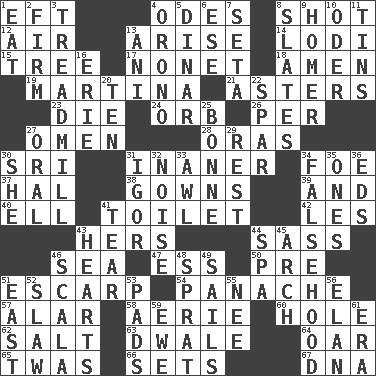 ACROSS 1. Lizard (obsolete) 4. Lyric poems 8. Attempt 12. Atmosphere 13. Originate 14. Farming town in central California 15. Woody plant 17. Music written for nine 18. So be it 19. Chrissie's court nemesis 21. Michaelmas daisies 23. Pass on 24. Globe 26. For each 27. Sign of something about to happen 28. Mouths or openings 30. _ Lanka 31. Sillier 34. Enemy 37. Actor Linden 38. Long dresses 39. Added to 40. Pipe bend 41. Bathroom 42. French article 43. Possessive pronoun 44. Backtalk 46. Ocean 47. Double-curved letter 50. Before (prefix) 51. Fortification 54. Flamboyance 57. Having or resembling wings 58. Nest on high 60. Hollow 62. Table seasoning 63. A sleeping potion; an opiate (poet.) 64. Rowing implement 65. It was, poetically 66. Puts into a specified state 67. Heredity factor (abbr.) DOWN 1. Ingest 2. Become taut 3. Excercise machine 4. U. of Maine site 5. Middle Eastern gold or silver currency 6. Compass dir. 7. Stalk of a moss capsule 8. Chalkboards 9. Simpsons dad 10. River in Europe 11. Airtight sealed metal containers 13. Cuckoo 16. 4th largest of the Great Lakes 20. "___ Little Indians" 22. Practice fight 25. Maid-servant 27. Spoken 29. State of inaction 30. A female animal or person 31. Russian composer Stravinsky 32. Annoying sound 33. Leather borer 34. It jiggles the polygraph 35. Singles 36. Begley and Asner 41. Lacerate 43. Centers of feelings and intuitions 44. Health resort 45. Bowlike part 46. Any of the three canals of the cochlea 48. Small fatty European fish 49. Travel by water 51. Compass direction 52. Cole _ (cabbage dish) 53. Groovy apts. 55. Born 56. Style 59. She-sheep 61. Epoch