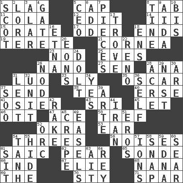 ACROSS 1. Volcanic refuse 5. Head covering 8. Keyboard key 11. Root beer relative 12. Prepare for publication 14. One more than two 15. Speak pompously 17. Baltic tributary 18. Conclusions 19. Cylindrical with tapered ends 21. Pupil covering 23. Dreamland 25. Nights before holidays 26. Billionth: prefix 27. Elected rep. 28. Santa ___, CA 31. Nilotic language 33. Wily 35. Witty Wilde 37. Transmit 38. Afternoon social gathering 40. Celtic language 41. Flexible twig of a willow tree 43. Indian title of respect (Mr.) 45. Allow 46. Baseball player Mel 47. Adept person 50. Unclean, religiously 52. Gumbo ingredient 53. Ewer handle 54. Threesomes 56. Annoying sounds 61. Ketch in the Levant 62. Lightbulb-shaped fruit 65. Message 66. Indiana (abbr.) 67. Writer Wiesel 68. Nanny 69. Definite Article 70. Filthy place 71. Coast Guard woman DOWN 1. Highlander 2. Old wives' tales, e.g. 3. Having or resembling wings 4. Yard entry 5. Corporate head (abbr.) 6. Say or write further 7. Parts 8. Prong on a fork 9. Opera by Verdi 10. Altar cloth linen 13. Collection of objects 16. Inactive volcano in Sicily 18. Followers of ems 20. Immeasurably long periods of time 22. Former U.S. Attorney General Janet 24. Stupid person 26. Connecting point 28. Measure of real estate 29. Political cartoonist Thomas 30. "We ___ not amused" (Victoria) 31. For fear that 32. A single undivided whole 34. Consenting reply 36. Automatic 37. "Barney Miller" actor Jack 39. Johnson of "Laugh-In" 42. Immoral or dissolute person 44. SW Asia republic 48. Streamer paper 49. Artist's stands 51. Greek god of love 52. The grampus (Milton) 54. Hyperbolic tangent 55. Flintstone garb 57. Charged particles 58. Fastener 59. Pulitzer Prize-winning author Ferber 60. Shrivel 61. Be seated 63. Small island 64. Marina Del _, California