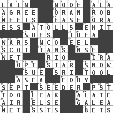 ACROSS 1. (Had) reclined 5. Connecting point 9. In the manner of 12. Match 14. Northwest Algerian city 15. Director Reiner 16. Confronts 17. Relaxation 18. Mouth or opening 19. Curvy letter 20. Ringlike coral islands and reefs 23. Give off 24. Institutes legal proceedings 25. The main thing one is thinking about 27. Armed conflicts 30. Non-commissioned officer (abbr.) 32. Snakelike fish 33. Highlander 34. Scottish caps 36. Overdraft (abbr.) 38. Dripping 39. River (Sp.) 40. Retirement account (abbr.) 43. Elect 46. Play the lead 48. Frozen precipitation 49. Institute legal proceedings 51. _ Lanka 52. Utensil 53. At sea 54. Whirlpool 56. Back-to-school mo. 58. Sowing specialist 61. Pacific Standard Time (abbr.) 64. Wedding promise 65. Path through which fluid escapes 66. Having winglike extensions 68. Wind 69. Otherwise 70. An organ shaped like a helmet 71. Was introduced to 72. Fast planes 73. Antes DOWN 1. Unable to walk 2. Eras 3. Angers 4. Fish or hair follower 5. Christmas carol 6. Spoken 7. Small ungulate mammals of Africa 8. Compass dir. 9. Odor 10. Australian parrot (variant) 11. Blind as ____ 13. Son of Isaac 21. Portable shelter 22. Motion picture awards 23. Snakelike fish 24. Fast jet (abbr.) 26. Lair 27. Compass dir. 28. Adept person 29. Printing process, for short 31. Leaves out 35. Flew 37. A pale, very dry sherry 41. Friend of Pooh 42. Leather borer 44. Inconspicuous attention getter 45. Third day of the wk. 47. Travel on an animal 48. Filthy place 50. Artist's stands 53. To the left, to Queeg 55. To draw with force 56. Thailand, formerly 57. Singer Brickell 59. 90 degrees 60. Supplements with great effort 61. Light colored 62. Proofreading order 63. Afternoon social gatherings 65. French article 67. Experiment locale