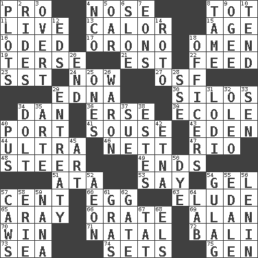 ACROSS 1. Adept person 4. Sense of smell 8. Small child 11. Not recorded 13. Bodily heat indicating an inflammation 15. Grow older 16. Wrote a lyric poem 17. U. of Maine site 18. Sign of something about to happen 19. Laconic 21. Eastern Standard Time (abbr.) 22. Nourish 23. Fast jet (abbr.) 24. At this time 27. Order of Saint Francis (abbr.) 29. Pulitzer Prize-winning author Ferber 30. Grain storage towers 34. One of the 12 tribes of Israel 36. Celtic language 39. Learning spot: Fr. 40. Sweet dark-red dessert wine 41. Boozer 43. Paradise 44. Extremist 46. Remaining after all deductions 47. _ de Janeiro 48. Bull 49. Extremities 51. "One Day ___ Time" 53. Declare 54. Set 57. Penny 60. Ovum 63. Dodge 65. Like ___ of sunshine 66. Speak pompously 69. Actor Alda or Thicke 70. Acquire through effort 71. Relating to or accompanying birth 72. Indonesian resort city 73. Ocean 74. Puts into a specified state 75. Commissioned military rank (abbr.) DOWN 1. Secret plans 2. Amusement-park features 3. Unconcealed 4. Non-commissioned officer (abbr.) 5. Rowing implement 6. _ gin 7. Immeasurably long periods of time 8. Docile 9. Double curve, resembling the letter S 10. Be inclined (to) 12. Begley and Asner 14. Printing process, for short 18. Persons of authority 20. Conclude 25. Singles 26. Make _____ (do battle with) 28. Compass dir. 29. Plea 31. Farming town in central California 32. Butter sub 33. Elected rep. 34. Stupid person 35. Johnson of "Laugh-In" 37. Institute legal proceedings 38. _____ Park, CO 40. Fluid product of inflammation 42. Inactive volcano in Sicily 45. Tate display 50. Color 52. Age 54. POW camp 55. Peak District village in England 56. Soviet premier 1918-24 57. Crow sounds 58. 4th largest of the Great Lakes 59. Grandmother 61. Pate de foie ____ 62. Yard entry 64. Experiment locale 67. Make lace 68. Raised railways