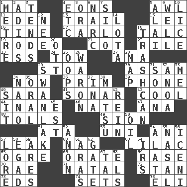 ACROSS 1. Floor covering 4. Immeasurably long periods of time 8. Leather borer 11. Genesis locale 13. Drop behind 15. Luau accessory 16. Prong on a fork 17. Monte _, Las Vegas Hotel/Casino 18. Baby powder 19. Cowboy competition 21. Small bed 22. Cause heat under the collar 23. Double-curved letter 24. Pull behind 27. Wet nurse (var.) 29. Portico 30. Indian state 34. Immediately 36. Demure 39. Give a jingle 40. "Two Mules for Sister ____" 41. Echolocation 43. Calm and collected 44. Lacking in sense or substance 46. Nathan's nickname 47. Santa ___, CA 48. For Whom the Bell _____ 49. The Jewish people; Israel 51. _ moment's notice (2 wds.) 53. Corn or form start 54. Black tropical American cuckoo 57. Path through which fluid escapes 60. Tired old horse 63. Pale purple color 65. Legendary monster 66. Declaim 69. To erase 70. Actress Charlotte 71. Brizilian seaport 72. Comedian Laurel of Laurel & Hardy 73. Begley and Asner 74. Arranges properly for use 75. Biblical high priest DOWN 1. Distance measurement (Brit.) 2. Goodbye (Sp.) 3. Is inclined (to) 4. And so on (abbr.) 5. Mouth or opening 6. Drug cop 7. Grain storage tower 8. Jai ____ 9. Water source 10. Louse (plural) 12. Born 14. Globular water bottle used in Asia 18. File 13 20. Baseball player Mel 25. I made a mistake 26. Make _____ (do battle with) 28. Atlas unit 29. Tchaikovsky ballet 31. Within a short period 32. Small Philippine buffalo 33. Cartoonist voice _ Blanc 34. Billionth: prefix 35. Taken by mouth 37. _ tizzy (2 wds.) 38. Taiwanese island in East China Sea 40. Be seated 42. It's straight from the horse's mouth 45. Eastern Standard Time (abbr.) 50. Petroleum 52. Soon (poet.) 54. Having winglike extensions 55. Rhinal 56. Ancient Celtic tribe of eastern Britain 57. Old wives' tales, e.g. 58. Mild oath 59. Ancient Greek god of war 61. Ancient river in northeast Turkey 62. Yard entry 64. Big collection agency 67. Make lace 68. Raised railways
