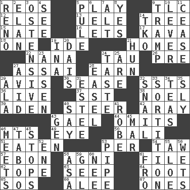 ACROSS 1. Vintage cars 5. Romp 9. Affectionate concern, for short 12. Otherwise 13. Ubangi River tributary 14. Woody plant 15. Nathan's nickname 16. Allows 17. Polynesian shrub of the pepper family 18. Single 19. Binary compound 21. Residences 22. Nanny 24. The 19th letter of the Greek alphabet 26. Before (prefix) 27. Slender Brazilian palm 28. Merit 29. Opinion 30. Gospel singer Marvin 32. Fast planes 36. Not recorded 37. Fast jet (abbr.) 38. Christmas carol 39. Arabian gulf 40. Bull 42. Like ___ of sunshine 43. Highlander 44. Leaves out 46. Mountains (abbr.) 49. Sight organ 50. Indonesian resort city 51. Ingested 53. For each 54. The 23rd letter of the Hebrew alphabet 57. Inky black, to poets 58. Hindu god of fire 61. Do some clerical work 62. Drink excessively 63. Ooze 64. Carrot, for example 65. Mayday 66. Toward shelter 67. Washington bills DOWN 1. Former U.S. Attorney General Janet 2. Enthusiasm 3. Clearly or manifestly demonstrative 4. Perceive with the eye 5. Whine 6. Area sheltered from the wind 7. Keyboard modifier key 8. Consenting reply 9. _____ steamer (cargo ship) 10. Crowbar 11. Stop 14. Ring climax 19. _ tizzy (2 wds.) 20. Raised platform 21. Attila the _ 23. NE Netherlands city 24. Clothes sense 25. "We ___ not amused" (Victoria) 27. Enthusiastic 28. Artist's stand 29. According to 31. First name in cosmetics 32. Slow-paced one 33. Making a chance decision by using lots 34. Beverages made from leaves 35. Wily 40. Declare 41. Loose flowing garment 43. Commissioned mil. rank 45. Spoil 46. Confronts 47. Off limits 48. Halts 52. Compass dir. 53. Corncob 55. _ vera 56. Moistens 58. White ___ sheet 59. Set 60. Born 61. Back