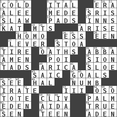 ACROSS 1. Lacking warmth 5. Slanted text style (abbr.) 9. Period 12. Toward shelter 13. Ancient Persian 14. Indian titles of respect 15. Cole _ (cabbage dish) 16. Writing tablets 17. Taverns 18. Krazy ___ of comics 19. Mountains (abbr.) 21. Ascend 22. Same (prefix) 24. Curvy letter 26. Car or cant ending 27. Prying instrument 28. Portico 29. Become fatigued 30. Profane or obscene expressions 32. Swedish rock group 36. So be it 37. Luau course 38. The Jewish people; Israel 39. Small boys 40. N. Chile seaport 42. A type of plum 43. Ketch in the Levant 44. Purposes of endeavors 46. Perceive with the eye 49. Actor Linden 50. Unfeeling 51. Feeling or showing extreme anger 53. One more than two 54. Bear (Spanish) 57. Lug 58. 154 in Roman numerals 61. Inside of hand 62. Locale of original sin 63. Opera by Verdi 64. Loyal 65. Elected rep. 66. Adolescent 67. An important port of Yemen DOWN 1. Keg 2. Water jar 3. Tough but pliablecoriaceous 4. Morning condensation 5. Naughty children 6. Beverage made from leaves 7. Increase 8. French article 9. Bert's buddy 10. Remove soap 11. NE Netherlands city 14. Title for a knight 19. Madame (abbr.) 20. "Corrida" creature 21. White ___ sheet 23. Baking chambers 24. Value system 25. Mayday 27. Pale green bean 28. Unemotional 29. Make lace 31. Showery time 32. Indian state 33. Big road sign 34. Expressions of contempt or scorn 35. A saturated hydrocarbon 40. American Automobile Association (abbr.) 41. Hindu god of fire 43. A female animal or person 45. Fr. "Yes" 46. Settings 47. Eat (away) 48. Eroded 52. Nine, plus one 53. "Terrible" tsar 55. Change direction abruptly 56. Presage 58. Feline 59. Falsehood 60. Binary compound 61. Parent Teacher Assoc.
