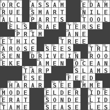ACROSS 1. The grampus (Milton) 4. Indian state 9. Dutch treat 13. Sorrow 14. Don Adams' spy role 15. Mediterranean tributary 16. 100% 17. Actors' quests 18. Utensil 19. Raised railways 21. Actress Charlotte 22. Laconic 24. Demure 26. One (Scot) 27. Moral principle 29. Family _ (genealogy) 30. Came up 31. Perceives with the eye 33. Three (prefix) 36. Elected rep. 37. Popular '50s hangout 40. Friend of Pooh 41. Make supply last 42. So be it 43. Sea 45. Canvas cover 47. Shuts with force 48. Compass dir. 49. Nourish 50. Ethiopian city, capital of Harari 52. Observe 54. Madame (abbr.) 56. Method 57. A person who is older than you are 59. Binary compound 61. Part of Q.E.F. 62. Something which is sent 63. Flaplike covering 64. Docile 65. Gospel singer Marvin 66. French article DOWN 1. Mouth or opening 2. General guideline 3. Portable communications device 4. Cleo's killer 5. Excessive but superficial compliments 6. "Two Mules for Sister ____" 7. Johnson of "Laugh-In" 8. Mountains (abbr.) 9. Main course 10. "Vaya con ____" 11. _ vera 12. Cartoonist voice _ Blanc 20. Indian titles of respect 22. Tarsus (plural) 23. Compass dir. 25. On the rocks 27. Comfort 28. Long journey 29. Adolescent 31. Simple or foolish person 32. Night before a holiday 33. Excercise machine 34. Wander aimlessly 35. Charged atoms 38. More valued for its uncommonness 39. Olfactory organ 44. Clement's nick name 45. Cigar-shaped 46. White ___ sheet 49. Eats 50. Israeli folk dance 51. First man 52. A type of plum 53. Pulitzer Prize-winning author Ferber 55. Singer Brickell 56. Was introduced to 57. Double-curved letter 58. To riddle 60. Begley and Asner