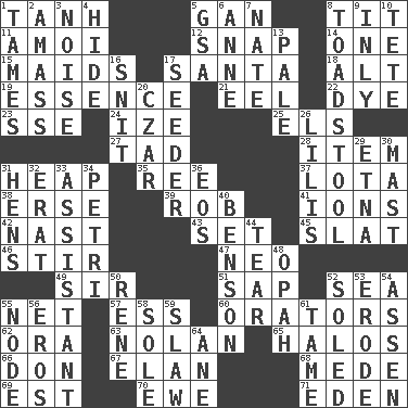 ACROSS 1. Hyperbolic tangent 5. Separate the seeds from cotton 8. Teat (slang) 11. Mine, in Marseilles 12. Fastener 14. Single 15. Women servants 17. Before Barbara or Clara 18. Keyboard modifier key 19. Core 21. Snakelike fish 22. Color 23. Compass dir. 24. Ending with capital 25. Raised railways 27. Bit 28. A whole individual unit 31. Pile 35. To riddle 37. Globular water bottle used in Asia 38. Celtic language 39. Director Reiner 41. Charged particles 42. Political cartoonist Thomas 43. Arrange properly for use 45. Narrow board 46. Use a swizzle stick 47. Modern: prefix 49. Title for a knight 51. Plant excrement 52. Ocean 55. Fish or hair follower 57. Double-curved letter 60. Speakers 62. Mouth or opening 63. Pitcher Ryan 65. Radiant circles of light 66. Spanish title 67. Style 68. Ancient Persian 69. Eastern Standard Time (abbr.) 70. She-sheep 71. Locale of original sin DOWN 1. Corrects by punishment or discipline 2. Collect or gather 3. Annoying sound 4. Flintstone garb 5. Girls' org. (abbr.) 6. Singer Murray 7. Nathan's nickname 8. Inedible or poisonous agaric 9. In an inward manner 10. False hair 13. Diluted with white 16. In a ____ (agitated or irritated) 17. Sowing specialist 20. Russian ruler of old 26. Ms. Damita and namesakes 29. Inactive volcano in Sicily 30. Vertical spar for supporting sails 31. Coop moms 32. Part of Q.E.F. 33. Helper 34. _ dish (used to culture cells) 36. Greek goddess of the dawn 40. Gillaume's butler role 44. Pull apart 48. Brightly colored fish 50. French philosopher Descartes 52. Having a sole or soles 53. Eat (away) 54. NE Netherlands city 55. Thickened enlargement 56. Greek god of love 58. Not divided or shared with others 59. Cole _ (cabbage dish) 61. Not wild 64. One (Scot)