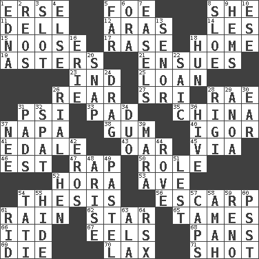 ACROSS 1. Celtic language 5. Enemy 8. A female animal or person 11. Small valley 12. Ancient river in northeast Turkey 14. French article 15. Trap for birds or small mammals 17. To erase 18. Dwelling 19. Michaelmas daisies 21. Takes place subsequently 23. Indiana (abbr.) 25. Grant temporary use of 26. Bring up, as a child 27. Indian title of respect (Mr.) 28. Actress Charlotte 31. Air pressure measure (abbr.) 33. Writing tablet 35. Large country 37. California wine valley 38. Chewing product 40. Russian composer Stravinsky 41. Peak District village in England 43. Rowing implement 45. By way of 46. Eastern Standard Time (abbr.) 47. Strike 50. Hero or heavy, e.g. 52. Israeli folk dance 53. "___ Maria" 54. College paper 56. Fortification 61. Water falling in drops from the sky 62. Play the lead 65. Domesticates 66. It would 67. Snakelike fish 68. Baking dishes 69. Expire 70. Not strict 71. Attempt DOWN 1. Pulitzer Prize-winning author Ferber 2. Vintage cars 3. Slit 4. Otherwise 5. At a great distance 6. Mouth or opening 7. Artist's stands 8. _ gin 9. Equivocates 10. Compass dir. 13. Sir (Sp.) 16. One of the Great Lakes 18. Attila the _ 20. Fastener 22. Ketch in the Levant 24. To draw with force 26. Monetary unit of Yemen 28. Swiss mountan, "Queen of the Mountains" 29. Small Philippine buffalo 30. Ewer handle 31. Groovy apts. 32. Argument over a trivial matter 34. Superhero pair 36. Hub of activity 37. Born 39. Hindu Mythology: god of death 42. Greek god of love 44. Be footloose 48. Originate 49. Soft color 51. For fear that 52. Layer 54. Jacques of French films 55. Flintstone garb 57. Smile enhancers 58. Nanny 59. Western Nevada city 60. Inconspicuous attention getter 61. To free from 63. Wing 64. Acura sports coupe