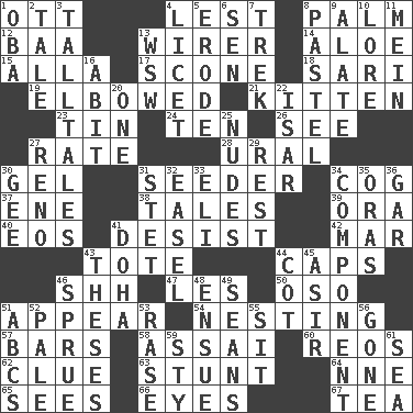 ACROSS 1. Baseball player Mel 4. For fear that 8. Inside of hand 12. Sound made by sheep 13. One who wires 14. _ vera 15. Silent film actress Nazimova 17. Biscuitlike quick bread 18. Indian skirt 19. Turned at an angle; bent 21. Baby cat 23. Metal container 24. "___ Little Indians" 26. Perceive with the eye 27. Pace 28. Mountain range 30. Set 31. Sowing specialist 34. Gear tooth 37. Compass dir. 38. Lies 39. Mouth or opening 40. Greek goddess of the dawn 41. Cease 42. Third mo. 43. Haul 44. Smile enhancers 46. Quiet! 47. French article 50. Bear (Spanish) 51. Become visible 54. Snuggling 57. Oblong pieces of solid material 58. Slender Brazilian palm 60. Vintage cars 62. A slight indication 63. Check the growth or development of 64. Compass dir. 65. Observes 66. Sight organs 67. Afternoon social gathering DOWN 1. Chief or king in Benin or Nigeria 2. Story 3. Baron Munchausen's specialties 4. It is permitted: Lat. 5. Eat (away) 6. Elected rep. 7. Long journey 8. Soft color 9. Having winglike extensions 10. Old wives' tales, e.g. 11. Count _ (2 wds.) 13. Compass dir. 16. "This won't hurt ____!" 20. Single 22. Austrian river, tributary to the Danube 25. Unadorned figures 27. Former U.S. Attorney General Janet 29. Respite 30. Unit of force equal to gravity 31. Proofreading order 32. Artist's stand 33. Connecticut Ivy Leaguer 34. Piece 35. Mouths or openings 36. Slender fish 41. Capital of the state of Qatar 43. College papers 44. Small bed 45. SW Saudi Arabia district 46. Upset 48. Take place subsequently 49. Seines 51. Lettered men learn these first 52. Diluted with white 53. To erase 55. Be seated 56. Went 59. Filthy place 61. Ocean