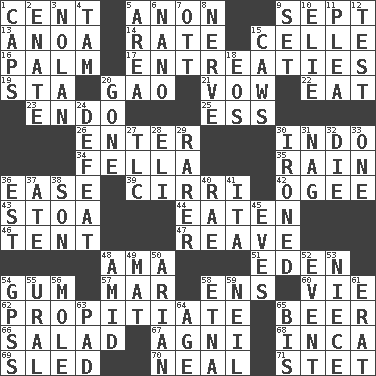 ACROSS 1. Penny 5. At once, immediately (arch.) 9. Back-to-school mo. 13. Small Philippine buffalo 14. Assign a rank or rating to 15. Cell (Danish) 16. Inside of hand 17. Pleas 19. R.R. building 20. E Mali city 21. Solemn pledge 22. Consume 23. Inside; within (prefix) 25. Curvy letter 26. Keyboard key 30. Southeast Asian peninsula 34. Man or boy (slang) 35. Water falling in drops from the sky 36. Relaxation 39. High-altitude cloud 42. Double curve, resembling the letter S 43. Portico 44. Consumed 46. Portable shelter 47. Break or tear apart 48. Nursemaid (var.) 51. Locale of original sin 54. Chewing product 57. Third mo. 58. Followers of ems 60. Compete 62. Conciliate 65. Fermented drink made from hops 66. First course 67. Hindu god of fire 68. South American Indian 69. Downhill vehicle 70. Actress Patricia 71. Proofreading order DOWN 1. Smile enhancers 2. Maternal 3. Pitcher Ryan 4. Scottish cap 5. Length times width 6. Billionth: prefix 7. Baseball player Mel 8. Boldness 9. Arrange properly for use 10. Writer Wiesel 11. Entreaty 12. Trial 15. Crow sounds 18. Greek goddess of the dawn 20. Went 24. Outscore 27. Affectionate concern, for short 28. Biblical high priest 29. Less widely known 30. Pressed 31. Tired old horse 32. Pass on 33. Single 36. Eastern Standard Time (abbr.) 37. Had dinner 38. Male offspring 40. Actress Charlotte 41. Call ___ day 45. Nights before holidays 48. Among 49. Floor protector 50. Believer in; advocate of (suffix) 52. Happening 53. Sibling's daughter 54. Global Positioning Systems (abbr.) 55. Mountain range 56. Undercover agent 58. Inactive volcano in Sicily 59. Famous astronaut Armstrong 61. Part of Q.E.F. 63. Writing tablet 64. Personal question 65. Altar cloth linen