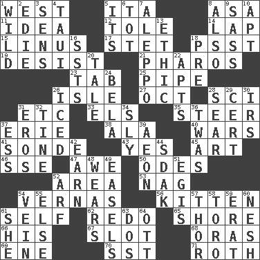 ACROSS 1. 270 degrees 5. Call ___ day 8. White ___ sheet 11. The content of cognition 12. Lacquered or enameled metalware 14. Pet locale 15. "_ and Lucy" (Charlie Brown theme song) 17. Proofreading order 18. Inconspicuous attention getter 19. Stop 21. N Egypt peninsula 23. Keyboard key 25. Corncob 26. Capri or Wight 27. Sep. follower 28. _-fi 31. And so on (abbr.) 33. Raised railways 35. Navigate 37. One of the Great Lakes 38. Wing 40. Armed conflicts 41. Something which is sent 43. Affirmative reply 45. Nonscientific branch of learning 46. Compass dir. 47. Deep reverence 50. Lyric poems 52. Type of rug 53. Tired old horse 54. Actresses Bloom and Felton 56. Baby cat 61. Oneself 62. Redecorate 65. Dinah or Pauly 66. Part of HMS, perhaps 67. Narrow, elongated depression 68. Mouths or openings 69. Compass dir. 70. Fast jet (abbr.) 71. Writer of Portnoy's Complaint (1969) DOWN 1. Rampant 2. Singer Brickell 3. Elected reps. 4. "Change" in Tahitian 5. ___ a Wonderful Life 6. Small child 7. City in Syria 8. In addition 9. Backtalk 10. Fitting 13. Value system 16. Fast planes 18. Before (prefix) 20. Story 22. Tenement units (abbr.) 24. Actor Lugosi 26. On the rocks 28. Scorch 29. Sure thing 30. Big collection agency 31. Greek god of love 32. Prong on a fork 34. Insidious 36. It was, poetically 37. Curvy letter 39. Age 42. Merit 44. Neighbor of Neb. 48. Puts on (as clothing) 49. Artist's stands 51. Armor plate that protects the chest 52. Sandy's bark 54. Distinctive style or manner 55. Otherwise 57. Son of Odin 58. "Corrida" creature 59. Part of Q.E.F. 60. Soft 61. A female animal or person 63. Two (Sp.) 64. Baseball player Mel