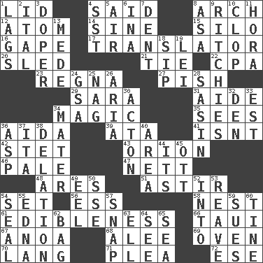 ACROSS 1. Hat (slang) 4. Alleged 8. Bowlike part 12. Smallest unit of an element 14. Trig term 15. Grain storage tower 16. Stare wonderingly 17. Interpreter 20. Downhill vehicle 21. Standoff 22. Numbers guy (abbr.) 23. Canadian anthropologist Darnell 27. Expression of disdain 29. "Two Mules for Sister ____" 31. Assistant 34. Mysterious quality of enchantment 35. Perceives with the eye 36. Opera by Verdi 39. "One Day ___ Time" 41. Is not 42. Proofreading order 43. Constellation of myth 46. Diluted with white 47. Remaining after all deductions 48. Ancient Greek god of war 51. Being in motion 54. Arrange properly for use 56. Double-curved letter 58. A home for chicks 61. The property of being fit to eat 66. "Change" in Tahitian 67. Small Philippine buffalo 68. Toward shelter 69. Baking chamber 70. Long (Scottish) 71. Entreaty 72. Compass dir. DOWN 1. Straggles 2. Slanted text style (abbr.) 3. Drug addict 4. Fast jet (abbr.) 5. Wind 6. _ tizzy (2 wds.) 7. Incision 8. White ___ sheet 9. Actors Guy, Robert Welles, and Clint 10. Hoof sound 11. Israeli folk dance 13. Ancient Persian 18. Small drink 19. Flowery wreath 24. Girls' org. (abbr.) 25. Tired old horse 26. Operatic vocal solo 28. Indian antelope 30. Gambison 32. Lair 33. Eastern Standard Time (abbr.) 34. Mother 36. Viper 37. Call ___ day 38. Conveyance 40. Length times width 44. It is 45. Baseball player Mel 49. Snakelike fish 50. Compass dir. 52. To the inside or interior of 53. Rob, plunder, or pillage 54. Lick closed 55. Pulitzer Prize-winning author Ferber 57. Fastener 59. Takes to court 60. Prong on a fork 62. Container for groceries 63. Pipe bend 64. Observe 65. Ocean