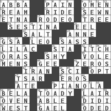 ACROSS 1. Swedish rock group 5. Ache 9. Sign of something about to happen 13. 480, 500 or 516 sheets of paper 14. Travel on an animal 15. Stitched 16. Inactive volcano in Sicily 17. Cowboy competition 18. Relationship diagram 19. French poetic form 21. Snakelike fish 22. Table seasoning 23. Singer Murray 24. Girls' org. (abbr.) 27. Lion 28. Backtalk 29. Pale purple color 31. R.R. building 32. Hankering 36. Mouths or openings 37. Like a shrinking violet 38. Grand slam 39. Not women's 40. Turn to the right 41. Nothings 42. SW Asia republic 44. _-fi 46. Choose 47. Russian ruler of old 48. Greek god of love 50. Had dinner 51. Player piano 54. Actor Lugosi 56. Sycophant 58. Den 60. Baking chamber 61. Competent 62. "You Light Up My Life" star Conn 63. 270 degrees 64. Highlander 65. Wrote a lyric poem DOWN 1. "We ___ not amused" (Victoria) 2. Antes 3. Object of repulsion 4. Collect or gather 5. Right away 6. Opera by Verdi 7. Binary compound 8. Modern: prefix 9. Clearly or manifestly demonstrative 10. Haggard of country music 11. She-sheep 12. Compass dir. 17. Cause heat under the collar 20. Baby powder 21. Followers of ems 23. Auto club (abbr.) 24. Seize upon or latch onto something 25. Title for a man of rank and authority 26. ____ Jay Lerner 28. Filthy place 30. Helper 31. A female animal or person 33. "Corrida" creature 34. Hoof sound 35. Behest 37. Elected rep. 40. Slender fish 41. The Jewish people; Israel 43. Actress Charlotte 44. Beer mug 45. Supercomputer manufacturer 47. Stories 49. Twentieth part of a lira 51. Light colored 52. Put down 53. Helper 54. Arrow shooter 55. First lady 56. Label 57. Chief or king in Benin or Nigeria 59. To free from