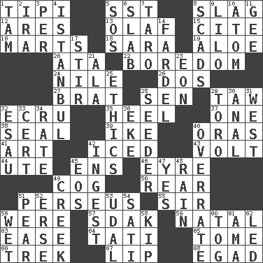 ACROSS 1. Native american tent (variation) 5. Fast jet (abbr.) 8. Volcanic refuse 12. Ancient Greek god of war 13. Norwegian king 15. Quote 16. Shops 18. "Two Mules for Sister ____" 19. _ vera 20. _ moment's notice (2 wds.) 22. Mood resulting from idleness 24. "Death on the ____" 26. Two (Sp.) 27. Naughty child 28. Elected rep. 29. The 23rd letter of the Hebrew alphabet 32. Shade of tan 35. The bottom of a shoe or boot 37. Single 38. Lick closed 39. Mamie's husband 40. Mouths or openings 41. Nonscientific branch of learning 42. On the rocks 43. Electrical Unit 44. Shoshoni 45. Followers of ems 46. Jane of fiction 49. Gear tooth 50. Located in or toward the back 51. Son of Zeus who helped slay Medusa 55. Title for a knight 56. We are 57. Neighbor of Neb. 59. Relating to or accompanying birth 63. Comfort 64. Jacques of French films 65. Heavy book 66. Long journey 67. Mouth edge 68. Mild oath DOWN 1. Scottish cap 2. Lyricist Gershwin 3. For each 4. Byzantium, centuries later 5. Distress signal 6. Broad, flat, thick piece 7. Pacific island yam 8. Large numbers or amounts 9. _ and Stitch 10. Smallest unit of an element 11. Unit of force equal to gravity 14. Bundle 17. Use a spoon 21. In the manner of 23. Period of immesurable duration 25. Value system 28. Sowing specialist 29. "Corrida" creature 30. Of or related to the anus 31. Compass direction 32. Son of Isaac 33. Foregone conclusion 34. Pace 36. Make supply last 40. Make much ado about nothing 42. Eat 45. Greek goddess of the dawn 47. Consenting reply 48. Water falling in drops from the sky 49. Small stream 51. Lightbulb-shaped fruit 52. Celtic language 53. Freehold land 54. Suttee (variant) 56. Soggy 58. Sleep 60. Coat; cloak 61. Housemaid (var.) 62. Directed
