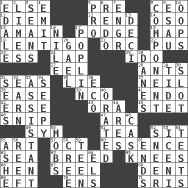 ACROSS 1. Otherwise 5. Before (prefix) 8. Corporate head (abbr.) 11. South Vietnam president (1954) 12. Tear apart 14. Bear (Spanish) 15. At full speed 17. Plash 18. Atlas unit 19. Small, flat, pigmented spot on the skin 21. The grampus (Milton) 22. Ichor 23. Double-curved letter 24. Infant locale 25. Wedding promise 27. Snakelike fish 28. Pismires 31. Oceans 35. Falsehood 37. Famous astronaut Armstrong 38. Comfort 39. Non-commissioned officer (abbr.) 41. Inside; within (prefix) 42. Celtic language 43. Mouth or opening 45. Proofreading order 46. Clip 47. Curve 49. Symbol (abbr.) 51. Afternoon social gathering 52. Be seated 55. Tate display 57. Sep. follower 60. Substance 62. Ocean 63. A special lineage 65. Leg joints 66. Layer 67. Sew up the eyelids of hawks and falcons 68. Scratch 69. Bank Draft (abbr.) 70. Followers of ems 71. Indian titles of respect DOWN 1. Peak District village in England 2. Citrus fruits 3. Actors Connery and Penn 4. Give off 5. Adept person 6. Do over again 7. Engineer (abbr.) 8. Piece 9. Son of Isaac 10. I made a mistake 13. Tenth: prefix 16. The longest river in the world 17. Cotton for raincoats, e.g. 20. Highlander 26. Natives or inhabitants of Denmark 29. Periodic rise and fall of the sea level 30. Narrow opening 31. Perceives with the eye 32. Merit 33. Aide 34. Not well drained, as in land 36. Environmental prefix 40. Spoke pompously 44. Ancient Greek god of war 48. Keg 50. Crowds into 52. Scornful expression 53. Ancient Celtic tribe of eastern Britain 54. Trials 55. American tennis player Robert 56. Coral ridge 58. Algonquian 59. Adolescent 61. Extremities 64. Raised railways