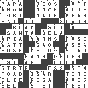 ACROSS 1. Dad 5. "Vaya con ____" 9. Baseball player Mel 12. Soon (poet.) 13. At one time in the past 14. 43,560 square feet 15. Australian parrot (variant) 16. Nathan's nickname 17. Stern 18. Ingest 19. Teat (slang) 21. Loads 22. 480, 500 or 516 sheets of paper 24. Put into a specified state 26. Born 27. Before Barbara or Clara 28. Actor Lugosi 29. Capital of Western Samoa 30. Entertaining tales 32. Introduce or present, as a question 36. Electrical Unit 37. E Mali city 38. At sea 39. Celtic language 40. Paris' subway 42. Play the lead 43. Baking dishes 44. Prevent from occurring 46. Eastern Standard Time (abbr.) 49. Tate display 50. Genesis locale 51. Remove all contents or possession from 53. Curvy letter 54. Elected rep. 57. Frog relative 58. Austrian river, tributary to the Danube 61. Hoop that covers a wheel 62. Writer Wiesel 63. Capital of Latvia 64. Deliberation 65. Snakelike fish 66. Proofreading order 67. Confront DOWN 1. Diluted with white 2. Small Philippine buffalo 3. Likenesses of persons 4. Cuckoo 5. Do not 6. _ tizzy (2 wds.) 7. Sep. follower 8. Observe 9. Sea 10. Swap 11. Laconic 14. Curve 19. Make lace 20. "If ____ say so..." 21. R.R. building 23. Maternal 24. Sir (Sp.) 25. Raised railways 27. Practice fight 28. Naughty children 29. Deep reverence 31. Representative 32. Thick mixture 33. Clearly or manifestly demonstrative 34. Shrivel 35. Ewer handle 40. Third mo. 41. Lyric poems 43. Infant food 45. Begley and Asner 46. First name in cosmetics 47. Took without asking 48. Go after with the intent to catch 52. Binary compound 53. Part of Q.E.F. 55. 4th largest of the Great Lakes 56. A home for chicks 58. Big collection agency 59. Be seated 60. Mature 61. Scottish cap