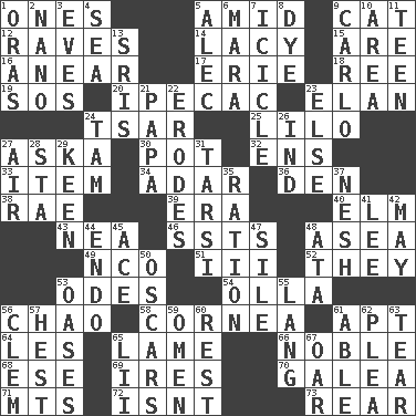 ACROSS 1. Singles 5. Among 9. Feline 12. All-night dance parties 14. Made of lace 15. "We ___ not amused" (Victoria) 16. Approach 17. 4th largest of the Great Lakes 18. To riddle 19. Distress signal 20. Medicinal drug used to evoke vomiting 23. Liveliness 24. Russian ruler of old 25. _ and Stitch 27. "____ silly question..." 30. Cooking vessel 32. Followers of ems 33. A distinct part 34. The sixth month of the Jewish calendar 36. Lair 38. Actress Charlotte 39. Epoch 40. Shade tree 43. Teachers' org. 46. Fast planes 48. At sea 49. Non-commissioned officer (abbr.) 51. One more than two 52. Those things 53. Lyric poems 54. Rounded earthenware pot or jar 56. US Secretary of Labor Elaine L. _ 58. Pupil covering 61. Fitting 64. French article 65. Unable to walk 66. Having high moral qualities 68. Compass dir. 69. Angers 70. An organ shaped like a helmet 71. Mountains (abbr.) 72. Is not 73. Posterior DOWN 1. Mouths or openings 2. Billionth: prefix 3. Nights before holidays 4. Ocean 5. Actor Baldwin 6. Hindu Mythology: god of death 7. Hanging ice 8. Color 9. Monte _, Las Vegas Hotel/Casino 10. Length times width 11. Adolescent 13. Indian titles of respect 21. Dad 22. Eats (away) 23. Otherwise 24. Scottish cap 26. Working for oneself (abbr.) 27. Atmosphere 28. R.R. building 29. Peachy ____! 31. Tarsus (plural) 35. Food allowance for one day 37. Delicate 41. Area sheltered from the wind 42. Can I? 44. Inside; within (prefix) 45. Adept person 47. Drop; flow; fall 48. "One Day ___ Time" 50. Motion picture awards 53. Fertile tracts in a desert 55. Austrian-born American filmmaker Fritz 56. Clement's nick name 57. Behest 59. Presage 60. State of inaction 61. Competent 62. Entreaty 63. Separate forcefully 65. Cards in a Roman deck? 67. Rowing implement