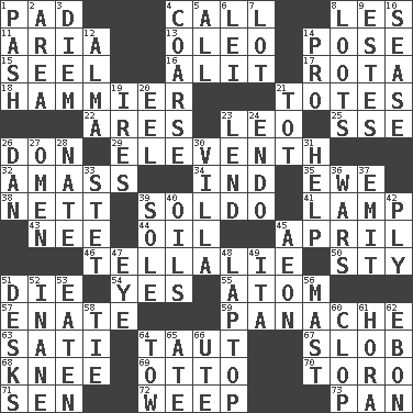 ACROSS 1. Groovy apt. 4. Give a ring to 8. French article 11. Roberta Peters solo 13. Butter sub 14. Airs 15. Sew up the eyelids of hawks and falcons 16. Set down 17. Round or rotation of duties 18. More overdramatic by comparison 21. Lugs 22. Ancient Greek god of war 23. Lion 25. Compass dir. 26. Spanish title 29. Veterans Day date 32. Collect or gather 34. Indiana (abbr.) 35. She-sheep 38. Remaining after all deductions 39. Twentieth part of a lira 41. Desk light 43. Born 44. Lubricate 45. Showery time 46. Copy Pinocchio 50. Filthy place 51. Pass on 54. Affirmative reply 55. Tiny particle 57. Maternal 59. Flamboyance 63. Suttee (variant) 64. Drawn tight 67. Oscar Madison type 68. Leg joint 69. Von Bismarck 70. "Corrida" creature 71. Elected rep. 72. Shed a tear 73. Baking dish DOWN 1. Romantic infatuation 2. Type of rug 3. South Vietnam president (1954) 4. Rough 5. 100% 6. Luau accessory 7. Car dealer's back yard 8. Plunders 9. _____ Park, CO 10. Gospel singer Marvin 12. _ mater 14. Adept person 19. Angers 20. Snakelike fish 21. Small child 23. Grant temporary use of 24. Inside; within (prefix) 26. One of the 12 tribes of Israel 27. Sign of things to come 28. Nathan's nickname 30. Country residence 31. Assist 33. Proofreading order 36. Armed conflicts 37. Give off 39. Not divided or shared with others 40. Lubricates 42. Travel a route regularly 45. A really long time 47. Sight organ 48. Portable computer 49. Call ___ day 51. Writing tables 52. Silly 53. Eroded 56. Vertical spar for supporting sails 58. Make a knot 60. Hoof sound 61. Israeli folk dance 62. Inky black, to poets 64. Pull behind 65. Had dinner 66. Shoshoni