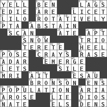 ACROSS 1. Shout 5. Benjamin's nick name 8. Falls behind 12. Singer Brickell 13. "We ___ not amused" (Victoria) 14. It is permitted: Lat. 15. _ and Stitch 16. Rotating or pertaining to rotation 19. Parent Teacher Association (abbr.) 20. Refrain by choice 21. Examine minutely or intensely 23. Had dinner 24. Fitting 27. Frozen precipitation 30. Musical group of three 31. Cigar-shaped 34. The bottom of a shoe or boot 35. Introduce or present, as a question 38. Trading vessels 40. To erase 41. The sixth month of the Jewish calendar 42. Develop 44. Allows 45. Drop; flow; fall 46. Medical imaging device (abbr.) 47. Small island 50. He sold his birthright 53. "Death Wish" actor 57. Followers of ems 59. Census information 63. Operatic vocal solo 64. Came up 65. Whopper 66. "Vaya con ____" 67. Nathan's nickname 68. Raised railways 69. Cub Scout units DOWN 1. Sharp bark 2. Proofreads 3. Pale purple color 4. Lion 5. Sharp remark 6. Greek god of love 7. Remaining after all deductions 8. 54 in ancient Rome 9. Adept person 10. Set 11. Filthy place 14. Actor's bit 17. Auto club (abbr.) 18. Teat (slang) 20. Queen of England 1702-14 22. Michaelmas daisies 24. Type of rug 25. Sliced desserts 26. Lacquered or enameled metalware 28. The grampus (Milton) 29. We are 30. Triplets 32. Scottish cap 33. Sight organs 35. Inside of hand 36. Baltic tributary 37. Suttee (variant) 39. _ Lanka 43. Small, secluded valley 47. Competent 48. Lyricist Gershwin 49. Small child 51. Nest on high 52. The state of being joined or united 54. Mediterranean tributary 55. Earth 56. Washington bills 58. Backtalk 59. Baking dish 60. Mouth or opening 61. Cooking vessel 62. Purpose 63. Find the sum of