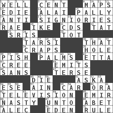 ACROSS 1. Water source 5. Penny 9. Atlas contents 13. Singer Brickell 14. Jai ____ 15. Chummy 16. Against 17. Seigniories (variant) 19. Actress Charlotte 20. Mamie's mate 21. Music discs 22. Make lace 23. Indian titles of respect 25. Small child 26. Tarsus (plural) 30. Not this but _ 34. Dice game 35. Hollow 36. Expression of disdain 39. Insides of hands 42. Singer James 43. Algonquian 44. Sends forth 46. Without 47. Laconic 48. Pass on 51. "____ silly question..." 54. Compass dir. 57. The 18th letter of the Arabic alphabet 58. 4-wheeled motor vehicle 60. Mouth or opening 62. Boob tube 65. Arab leader 66. Characterized by obscenity 67. To (old English) 68. Collude with 69. Actor Baldwin 70. Paradise 71. General guideline DOWN 1. Put on (as clothing) 2. Ferber et al. 3. 61 cubic inches 4. Flowery wreath 5. Keg 6. Writer Wiesel 7. Tired old horse 8. A color or tint 9. Impair 10. Set down 11. Entreaty 12. System (abbr.) 15. Mail 18. Wedding promise 20. Austrian river, tributary to the Danube 24. Strong, restless desires 27. Reproach for some lapse or misdeed 28. Health resort 29. Small island 30. College papers 31. Being at a high temperature 32. Keyboard modifier key 33. Beverage made from leaves 36. Personal Computers (abbr.) 37. Retirement account (abbr.) 38. Elected rep. 40. Madame (abbr.) 41. Title for a knight 45. Russian ruler of old 48. _ Jones' Locker 49. One more than two 50. Follow as a consequence or result 52. Dried seaweed eaten as food 53. Satellite of Uranus 54. Inactive volcano in Sicily 55. Lick closed 56. Otherwise 58. ____ d'Azur (French Riviera) 59. Soon (poet.) 61. Johnson of "Laugh-In" 63. And so on (abbr.) 64. Working for oneself (abbr.) 65. Hearing organ