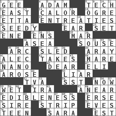 ACROSS 1. Turn to the right 4. First of billions? 8. Technical work 12. 90 degrees 14. Bodily heat indicating an inflammation 16. Legendary monster 17. Singer James 18. Pleas 20. Full of seeds 22. Ewer handle 23. Put into a specified state 24. Compass dir. 25. Followers of ems 28. Impair 30. Toward the sea 31. Boozer 35. Curve 37. Downhill vehicle 40. Like ___ of sunshine 41. Actor Baldwin 42. Proceeds 44. Female horse 45. Billionth: prefix 46. Letter starter 47. Connecticut Ivy Leaguer 48. Came up 50. One who doesn't tell the truth 52. Federal power corp. 54. Fast jet (abbr.) 55. Immediately 58. Soggy 61. Lyricist Gershwin 63. Approach 65. The property of being fit to eat 70. Celtic language 71. Beget 72. Remove all contents or possession from 73. Nights before holidays 74. Adolescent 75. "Two Mules for Sister ____" 76. Eastern Standard Time (abbr.) DOWN 1. Honkers 2. Ingested 3. First name in cosmetics 4. Adept person 5. One of the 12 tribes of Israel 6. The first octave above the treble staff 7. Greater amount 8. Small child 9. Armor plate that protects the chest 10. Algonquian 11. Command 13. Small amount or degree 15. 480, 500 or 516 sheets of paper 19. Caspian sea tributary 21. Affirmative reply 26. Egg locale 27. Vegetable dish 29. Nomad 30. Buttonhole 32. Mountain range 33. Indian skirt 34. Sight organ 35. Having or resembling wings 36. Western Nevada city 38. Supplement with great effort 39. Allots cards 41. Santa ___, CA 43. Indian titles of respect 49. Tending to cause great harm 51. _ moment's notice (2 wds.) 53. Ancient Greek god of war 55. Boldness 56. Fertile tracts in a desert 57. Obtain by seizing forcibly or violently 58. Compass direction 59. Singer Brickell 60. Hoop that covers a wheel 62. Pismires 64. Born 66. Benjamin's nick name 67. Period 68. Title for a knight 69. Health resort