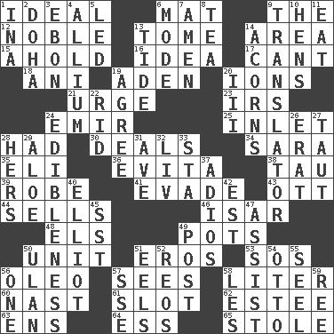 ACROSS 1. Perfect 6. Floor protector 9. Definite Article 12. Impressive in appearance 13. Heavy book 14. Length times width 15. Hold, grip (Informal) 16. The main thing one is thinking about 17. Patter 18. Black tropical American cuckoo 19. Arabian gulf 20. Charged particles 21. Goad 23. Big collection agency 24. Independent ruler or chieftain 25. An arm off of a larger body of water 28. Possessed 30. Allots cards 34. "Two Mules for Sister ____" 35. Biblical high priest 36. Webber/Rice musical 38. The 19th letter of the Greek alphabet 39. Loose flowing garment 41. Elude 43. Baseball player Mel 44. Makes a sale 46. Austrian river, tributary to the Danube 48. Raised railways 49. Plant holders 50. A single undivided whole 51. Greek god of love 53. Mayday 56. Butter sub 57. Observes 58. 61 cubic inches 60. Political cartoonist Thomas 61. Position in a hierarchy or organization 62. First name in cosmetics 63. Followers of ems 64. Double-curved letter 65. Took without asking DOWN 1. _ tizzy (2 wds.) 2. Capital of the state of Qatar 3. Inky black, to poets 4. Plant genus of onion and garlic 5. Directed 6. Method 7. So be it 8. Afternoon social gathering 9. Interpreter 10. Coop moms 11. Ingest 13. Periodic rise and fall of the sea level 14. Oak nuts 19. Match 20. One more than two 22. To free from 24. The property of being fit to eat 26. Part of Q.E.F. 27. Tense 28. Possessive pronoun 29. Medicinal plant 31. "___ Maria" 32. 54 in ancient Rome 33. R.R. building 37. Goodbye (Sp.) 40. American author Paul (1891-1958) 42. Eastern Standard Time (abbr.) 45. Fast jet (abbr.) 47. Help 49. Mail 50. ____ Bator 51. Snakelike fish 52. Vintage cars 54. Von Bismarck 55. Sew up the eyelids of hawks and falcons 56. Single 57. Compass dir. 58. French article 59. To riddle