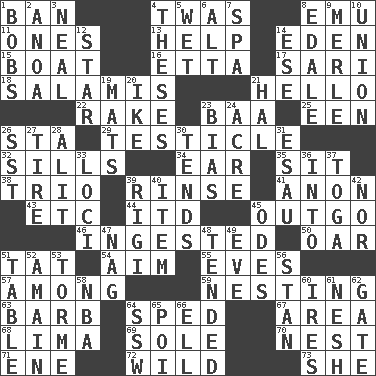 ACROSS 1. Bar 4. It was, poetically 8. Australian flightless bird 11. Singles 13. Assist 14. Genesis locale 15. Water vessel 16. Singer James 17. Indian skirt 18. Deli grouping 21. Phone greeting 22. Libertine 23. Sound made by sheep 25. Car or cant ending 26. R.R. building 29. One of the two male reproductive glands 32. Beverly of Met fame 34. Hearing organ 35. Be seated 38. Musical group of three 39. Wash lightly 41. Soon (poet.) 43. And so on (abbr.) 44. It would 45. Money paid out 46. Swallowed 50. Rowing implement 51. Make lace 54. Direct toward a target or goal 55. Nights before holidays 57. Amid 59. Inhabiting a nest 63. Sharp remark 64. Hurried 67. Type of rug 68. Pale green bean 69. Not divided or shared with others 70. A home for chicks 71. Compass dir. 72. Uncontrolled 73. A female animal or person DOWN 1. Moves up and down 2. Small Philippine buffalo 3. Be tempered by heat 4. College papers 5. Dripping 6. The first octave above the treble staff 7. Health resort 8. Peak District village in England 9. Haggard of country music 10. The state of being joined or united 12. Play the lead 14. Compass dir. 19. Floor protectors 20. Mamie's husband 21. Actor Linden 23. Prejudice 24. 1/640 square mile 26. Fast jet (abbr.) 27. Become fatigued 28. Came down and settled, as after flight 30. Watches over 31. Son of Isaac 33. Event scenes 36. To the inside or interior of 37. Ancient Roman robe 39. Swiss mountan, "Queen of the Mountains" 40. A distinct part 42. And not 45. Lyric poems 47. Tired old horse 48. Watched over 49. Night before a holiday 51. Eating place 52. At full speed 53. Singer Mel 56. Comedian Laurel of Laurel & Hardy 58. Basketball assoc. 60. Angers 61. Soft 62. Yard entry 64. Compass dir. 65. Luau course 66. Pipe bend