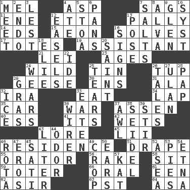 ACROSS 1. Cartoonist voice _ Blanc 4. Cleo's killer 7. Droops 11. Compass dir. 12. Singer James 13. Friendly 14. Begley and Asner 15. Age 16. Finds the solution 17. Lugs 19. Helper 21. Flowery wreath 23. Eons 24. Uncontrolled 25. Shallow baking pan 26. Uncastrated adult male sheep 29. Honkers 30. Followers of ems 31. Wing 32. Retirement account (abbr.) 33. Erode 34. Pet locale 35. Automobile 36. Armed conflict 37. NE Netherlands city 40. Curvy letter 41. It is 42. Moistens 43. Old wives' tales, e.g. 45. Cards in a Roman deck? 46. Home 51. Window treatment 55. Speaker 56. Immoral or dissolute person 58. Be seated 59. Carrier 60. Taken by mouth 61. Car or cant ending 62. SW Saudi Arabia district 63. Pacific Standard Time (abbr.) 64. White ___ sheet DOWN 1. Confront 2. Inside; within (prefix) 3. For fear that 4. Had dinner 5. Portico 6. Zero-star reviews 7. Table seasonings 8. Inventor's middle name 9. Small, secluded valley 10. System (abbr.) 12. Artist's stands 13. Airs 16. Attaches a signature 18. Writer Wiesel 20. Virtuous person 22. Binary compound 24. Puts on (as clothing) 25. Rends 26. Falsehoods 27. Uhlan (variant) 28. Infant food 29. Pate de foie ____ 32. Frozen water 33. Consumed 36. One who wires 37. Leather borer 38. A glass for beer 39. Commotion 43. 61 cubic inches 44. Scent 46. Roll call or roster of names 47. Greek god of love 48. Suttee (variant) 49. Riding implement 50. Hearing organs 52. At sea 53. Sliced desserts 54. Inactive volcano in Sicily 57. Krazy ___ of comics