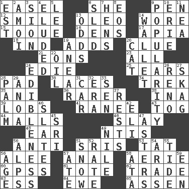 ACROSS 1. Artist's stand 6. A female animal or person 9. Fenced enclosure 12. Grin 13. Margarine 14. Had on 15. Woman's close-fitting hat 16. Hiding places for outlaws 17. Capital of Western Samoa 18. Indiana (abbr.) 19. Does sums 20. A slight indication 21. Immeasurably long periods of time 23. 100% 24. Singer Brickell 25. Lacerates 28. Groovy apt. 30. Shoestrings 34. Long journey 35. Cuckoo 36. More uncommon 38. _ tizzy (2 wds.) 39. Tennis shots 41. Indian princess (variant) 43. Coat; cloak 44. Shopping centers 46. Kill 48. Hearing organ 49. Nuclear Threat Initiatives 50. Against 51. Indian titles of respect 53. Make lace 56. Toward shelter 57. Of or related to the anus 58. Nest on high 60. Global Positioning Systems (abbr.) 61. Lug 62. Buy and sell 63. Curvy letter 64. She-sheep 65. NE Netherlands city DOWN 1. Eastern Standard Time (abbr.) 2. Mine, in Marseilles 3. The Jewish people; Israel 4. Dodged 5. Area sheltered from the wind 6. Downhill vehicle 7. Coop moms 8. Greek goddess of the dawn 9. Teen's desire 10. 4th largest of the Great Lakes 11. Teachers' org. 13. Likelihood 14. Place for singles 19. Approach 20. Domesticated feline 22. Lubricate 24. The property of being fit to eat 26. Western Nevada city 27. Heroin 28. Inside of hand 29. Small Philippine buffalo 31. Automobile 32. Period 33. Elected rep. 37. Musical pauses 40. Chalkboards 42. Connecticut Ivy Leaguer 45. _ Lanka 47. Michaelmas daisies 49. The longest river in the world 50. High mountains 51. Overwhelm 52. Pace 54. Caspian sea tributary 55. Event that recurs at intervals 56. Ripen 57. Had dinner 58. "One Day ___ Time" 59. Car or cant ending
