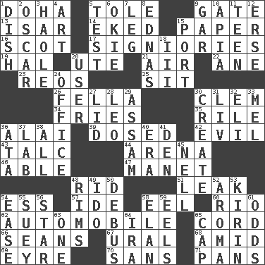 ACROSS 1. Capital of the state of Qatar 5. Lacquered or enameled metalware 9. Yard entry 13. Austrian river, tributary to the Danube 14. Made supply last 15. Some stationery 16. Highlander 17. Seigniories (variant) 19. Actor Linden 20. Shoshoni 21. Atmosphere 22. One (Scot) 23. Vintage cars 25. Be seated 26. Chap (slang) 30. Clement's nick name 34. Strips of potato fried in deep fat 35. Cause heat under the collar 36. Jai ____ 39. Administered medicine 42. Morally bad or wrong 43. Baby powder 44. Sports stadium 46. Competent 47. French painter Edouard 48. To free from 51. Path through which fluid escapes 54. Curvy letter 57. Binary compound 58. Snakelike fish 60. River (Sp.) 62. Form of transportation 65. Drawstring 66. Actors Connery and Penn 67. Mountain range 68. Among 69. Jane of fiction 70. Without 71. Zero-star reviews DOWN 1. Food container 2. Motion picture award 3. White Person, in Hawaii 4. Nonscientific branch of learning 5. Trial 6. Migrant worker of the '30s 7. Part of a journey 8. Ferber et al. 9. Slender fish 10. Capital of Western Samoa 11. Adolescent 12. Celtic language 15. Sweet dark-red dessert wine 18. One more than two 20. One who makes use of a thing 24. Position of authority 27. Flaplike covering 28. Lion 29. Indian state 30. Make 31. 54 in ancient Rome 32. Connecticut Ivy Leaguer 33. Cartoonist voice _ Blanc 36. _ moment's notice (2 wds.) 37. Experiment locale 38. Everything 40. Epoch 41. Lair 45. 1994 drama film starring Jodie Foster 48. Basketball hoops 49. Wedding promise 50. To get out of a bus 52. Odor 53. Japanese brewing company 54. Comfort 55. Chop _ 56. Play the lead 58. Flair 59. Snakelike fish 61. Probability 63. Single 64. Lyricist Gershwin 65. Head covering