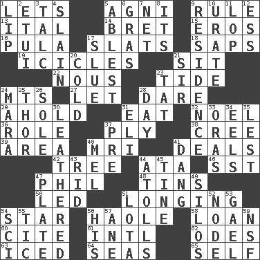 ACROSS 1. Allows 5. Hindu god of fire 9. Court order 13. Slanted text style (abbr.) 14. Cy Young winner Saberhagen 15. Greek god of love 16. Monetary unit of Botswana 17. Narrow boards 18. Plant excrements 19. Winter's stalactites 21. Be seated 22. Horse sense 23. Event that recurs at intervals 24. Mountains (abbr.) 27. Allow 28. Have the gumption 29. Hold, grip (Informal) 31. Erode 32. Christmas carol 36. Hero or heavy, e.g. 37. Travel a route regularly 38. Algonquian 39. Type of rug 40. Medical imaging device (abbr.) 41. Allots cards 42. Woody plant 44. "One Day ___ Time" 46. Fast jet (abbr.) 47. Silvers or Donahue 48. Metal containers 50. Directed 51. Yearning 54. Play the lead 56. White Person, in Hawaii 58. Grant temporary use of 60. Quote 61. International (abbr.) 62. Lyric poems 63. On the rocks 64. Oceans 65. Itself DOWN 1. Mouth edge 2. Needle holder 3. Baby powder 4. Killed 5. Most capable 6. Pate de foie ____ 7. Fish or hair follower 8. ___ a Wonderful Life 9. Dwelling 10. A salt of uric acid 11. Chop off 12. Double-curved letter 17. Change direction abruptly 20. Chilled 21. Title for a knight 23. Make lace 24. Hindu Mythology: god of death 25. Son of Odin 26. Flatfish 28. 24 hours 30. Resembling or made to resemble leather 31. Biblical high priest 33. Mouths or openings 34. Snakelike fish 35. For fear that 37. Before (prefix) 40. Cartoonist voice _ Blanc 41. Mild oath, euphamism for damn 43. To free from 44. Ringlike coral islands and reefs 45. Prong on a fork 47. Food holder 49. Grain storage towers 51. Globular water bottle used in Asia 52. Connecting point 53. Highlander 54. _-fi 55. Nervous spasm 56. Part of HMS, perhaps 57. One (Scot) 59. Science/research agcy.