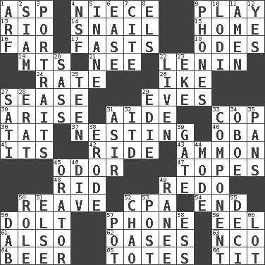 ACROSS 1. Cleo's killer 4. Sibling's daughter 9. Shaw product 13. _ de Janeiro 14. Slow-paced one 15. Residence 16. Distant 17. Goes without food and/or water 18. Lyric poems 19. Mountains (abbr.) 21. Born 22. Soviet premier 1918-24 24. Pace 26. D.D.E's nickname 27. Gospel singer Marvin 29. Nights before holidays 30. Get up 31. Assistant 33. Police officer (slang) 36. Make lace 37. Nestling 40. Chief or king in Benin or Nigeria 41. It is 42. Travel on or in a vehicle 43. ID or VA city 45. Aroma 47. Drinks excessively 48. To free from 49. Redecorate 50. Rob, plunder, or pillage 52. Tax preparer (abbr.) 54. Conclude 56. Stupid person 57. Give a jingle 59. Snakelike fish 61. In addition 62. Fertile tracts in a desert 63. Non-commissioned officer (abbr.) 64. Fermented drink made from hops 65. Lugs 66. Teat (slang) DOWN 1. Sandy's bark 2. Thailand, formerly 3. Likenesses of persons 4. Overdraft (abbr.) 5. Empty; void 6. Relaxation 7. Quote 8. Raised railways 9. Gives a jingle 10. Farming town in central California 11. So be it 12. Affirmative reply 20. Backtalk 22. Make or become more lively 23. Make supply last 25. Adolescent 27. Suttee (variant) 28. Part of Q.E.F. 29. Singer Brickell 31. SW Saudi Arabia district 32. It would 33. Part 34. Mitch Miller's instrument 35. Baking dishes 38. Eat (away) 39. Yard entry 44. Method 45. Speaker 46. HTML Container Element 49. The wife of a rajah (variant) 50. Hero or heavy, e.g. 51. Otherwise 52. US Secretary of Labor Elaine L. _ 53. Mail 55. Tenth: prefix 56. Apply (a substance) by light strokes 57. Cooking vessel 58. Double-curved letter 60. Car dealer's back yard