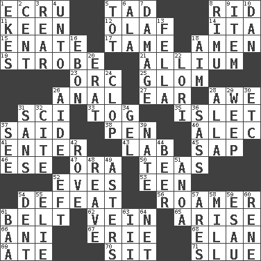 ACROSS 1. Shade of tan 5. Small boy 8. To free from 11. Peachy ____! 12. Norwegian king 14. Call ___ day 15. Related on the mother's side 17. Not wild 18. So be it 19. Disco prop 21. Plant genus of onion and garlic 23. The grampus (Milton) 25. Take by theft 26. Of or related to the anus 27. Hearing organ 28. Deep reverence 31. _-fi 33. Coat; cloak 35. Small island 37. Alleged 38. Fenced enclosure 40. Actor Baldwin 41. Keyboard key 43. Experiment locale 45. Plant excrement 46. Compass dir. 47. Mouth or opening 50. Afternoon social gatherings 52. Nights before holidays 53. Car or cant ending 54. Outscore 56. Wanderer 61. Waist strap 62. Distinctive style or manner 65. Ascend 66. Cuckoo 67. One of the Great Lakes 68. Flair 69. Had dinner 70. Be seated 71. Change direction abruptly DOWN 1. Makes supply last 2. Penny 3. Bring up, as a child 4. To (old English) 5. Small child 6. Wing 7. Break 8. Tall New Zealand timber tree 9. A whole individual unit 10. One of the 12 tribes of Israel 13. Man or boy (slang) 16. Inky black, to poets 18. Direct toward a target or goal 20. Part of Q.E.F. 22. Australian parrot (variant) 24. Hoof sound 26. Helper 28. Silent film actress Nazimova 29. Shed a tear 30. And so on (abbr.) 31. Without 32. Quote 34. Set 36. Backtalk 37. Perceive with the eye 39. Nathan's nickname 42. Be footloose 44. Fermented drink made from hops 48. Break or tear apart 49. Michaelmas daisies 51. Small Philippine buffalo 52. Lizard (obsolete) 54. Gouge 55. Writer Wiesel 57. Ancient Greek god of war 58. Place where flour is made 59. He sold his birthright 60. French philosopher Descartes 61. Sound made by sheep 63. One more than two 64. Fish or hair follower