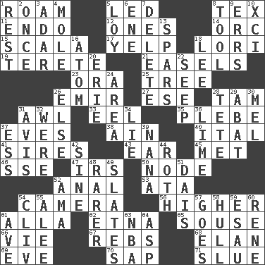 ACROSS 1. Wander aimlessly 5. Directed 8. John Ritter's dad 11. Inside; within (prefix) 12. Washington bills 14. The grampus (Milton) 15. Any of the three canals of the cochlea 17. Sharp bark 18. Australian parrot (variant) 19. Cigar-shaped 21. Artist's stands 23. Mouth or opening 25. Family _ (genealogy) 26. Independent ruler or chieftain 27. Compass dir. 28. Scottish cap 31. Leather borer 33. Snakelike fish 35. Cadet 37. Nights before holidays 38. The 18th letter of the Arabic alphabet 40. Slanted text style (abbr.) 41. Titles for men of rank and authority 43. Hearing organ 45. Was introduced to 46. Compass dir. 47. Big collection agency 50. Connecting point 52. Of or related to the anus 53. "One Day ___ Time" 54. Device for capturing images 56. Having greater elevation 61. Silent film actress Nazimova 62. Inactive volcano in Sicily 65. Lush 66. Compete 67. Confederate soldiers (slang) 68. Enthusiasm 69. Night before a holiday 70. Plant excrement 71. Turn sharply DOWN 1. Relief 2. Single time 3. The sixth month of the Jewish calendar 4. Undercover agent 5. Myrna of the movies 6. Compass dir. 7. Erase 8. Utensil 9. Blunders 10. One more than ninety 13. Practice fights 16. Smallest unit of an element 18. Area sheltered from the wind 20. 4th largest of the Great Lakes 22. Ooze 24. Type of rug 26. Otherwise 28. False hair 29. Blind as ____ 30. Cartoonist voice _ Blanc 31. Deliberation 32. We are 34. Falsehood 36. Welles in "The Third Man" 37. Double-curved letter 39. Nanny 42. Trig term 44. Writer of Portnoy's Complaint (1969) 48. More uncommon 49. Chalkboards 51. Raised platform 52. Wet nurse (var.) 54. 154 in Roman numerals 55. Toward shelter 57. Moves 58. Frame or body of a ship 59. He sold his birthright 60. French philosopher Descartes 61. "___ Maria" 63. Basketball assoc. 64. Cleo's killer