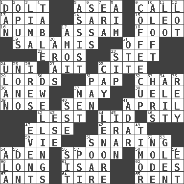 ACROSS 1. Stupid person 5. At sea 9. Give a ring to 13. Capital of Western Samoa 14. Indian skirt 15. Margarine 16. Unfeeling 17. Indian state 18. One third of a yard 19. Deli grouping 21. No longer planned or scheduled 22. Greek god of love 23. Proofreading order 24. University (slang) 27. Small island 28. Quote 29. Titled peers of a realm 31. Infant food 32. Burn to charcoal 36. Afresh 37. Can I? 38. Ubangi River tributary 39. Olfactory organ 40. Elected rep. 41. Showery time 42. For fear that 44. Hat (slang) 46. Filthy place 47. Otherwise 48. Part of Q.E.F. 50. Compete 51. Catching in a trap 54. Arabian gulf 56. Soup utensil 58. Undercover agent 60. Having great length 61. Austrian river, tributary to the Danube 62. Lyric poems 63. Pismires 64. Hoop that covers a wheel 65. Monthly bill DOWN 1. Daniel's nick name 2. Musical composition 3. Pale green bean 4. Eating place 5. Aid 6. Backtalk 7. Epoch 8. Direct toward a target or goal 9. Java holder (2 wds.) 10. High up in or into the air 11. Lion 12. Car dealer's back yard 17. Mine, in Marseilles 20. Ancient river in northeast Turkey 21. Baseball player Mel 23. Small drink 24. ____ Bator 25. Words to Nanette 26. Angers 28. Island 30. Homes 31. Baking dish 33. Possessive pronoun 34. Came down and settled, as after flight 35. Trust 37. Was introduced to 40. Compass dir. 41. The sixth month of the Jewish calendar 43. Compass dir. 44. Poe poem 45. SW Asia republic 47. Incident 49. The easternmost of the Lesser Sundas 51. Fly high 52. Connecting point 53. Small, secluded valley 54. In the manner of 55. Spanish title 56. Be seated 57. Air pressure measure (abbr.) 59. Eastern Standard Time (abbr.)