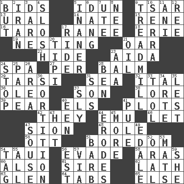 ACROSS 1. Auction offers 5. Goddess of spring and wife of Bragi 9. Russian ruler of old 13. Mountain range 14. Nathan's nickname 15. French philosopher Descartes 16. Pacific island yam 17. The wife of a rajah (variant) 18. One of the Great Lakes 19. Snuggling 21. Boat paddle 22. Flintstone garb 23. Opera by Verdi 24. Health resort 27. For each 28. Lip ointment 29. Tarsus (plural) 31. Ocean 32. Slanted text style (abbr.) 36. Butter sub 37. Male child 38. Old wives' tales, e.g. 39. Lightbulb-shaped fruit 40. Raised railways 41. Graphs 42. Those people 44. Australian flightless bird 46. Allow 47. The Jewish people; Israel 48. Hero or heavy, e.g. 50. Baseball player Mel 51. Mood resulting from idleness 54. "Change" in Tahitian 56. Dodge 58. Caspian sea tributary 60. In addition 61. Beget 62. Thin strip of wood or metal 63. Small, secluded valley 64. Bar bills 65. Otherwise DOWN 1. With the exception that 2. SW Asia republic 3. Have the gumption 4. Make a splashing sound 5. More empty; more void 6. Mild oath, euphamism for damn 7. Shoshoni 8. Born 9. Excercise machine 10. Spanish missionary in California 11. Cuckoo 12. Portuguese money of account (variant) 17. Travel on or in a vehicle 20. Native american tent (variation) 21. Petroleum 23. Auto club (abbr.) 24. Halt 25. Light colored 26. Length times width 28. Benjamin's nick name 30. Drawing lots 31. Mayday 33. Instrument 34. Johnson of "Laugh-In" 35. For fear that 37. Stealthy 40. Car or cant ending 41. Whine 43. Being at a high temperature 44. Eats (away) 45. Greater amount 47. Boozer 49. Peak District village in England 51. Sharp remark 52. Taken by mouth 53. Floor coverings 54. Label 55. Everything 56. Eastern Standard Time (abbr.) 57. By way of 59. A female animal or person