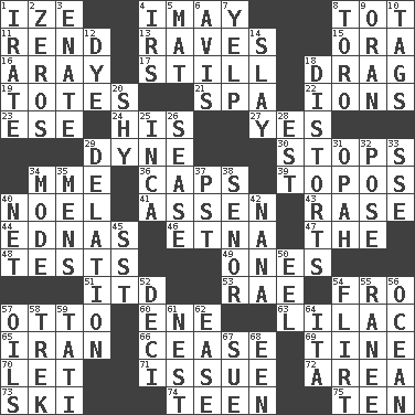 ACROSS 1. Ending with capital 4. "If ____ say so..." 8. Small child 11. Tear apart 13. All-night dance parties 15. Mouth or opening 16. Like ___ of sunshine 17. Free from disturbance or agitation 18. To be drawn or hauled along 19. Lugs 21. Health resort 22. Charged atoms 23. Compass dir. 24. Part of HMS, perhaps 27. It is so 29. Centimeter-gram-second unit of force 30. Obstructs or blocks passage 34. Madame (abbr.) 36. Balmoral and tarboosh 39. Literary convention 40. Christmas carol 41. NE Netherlands city 43. To erase 44. Ferber et al. 46. Inactive volcano in Sicily 47. Definite Article 48. Trials 49. Washington bills 51. It would 53. Actress Charlotte 54. From 57. "Beetle Bailey" pooch 60. Compass dir. 63. Pale purple color 65. SW Asia republic 66. Desist 69. Prong on a fork 70. Allow 71. Come out of 72. Length times width 73. What Jean-Claude Killy likes to do 74. Adolescent 75. Nine, plus one DOWN 1. Feeling or showing extreme anger 2. Nothings 3. Maternal 4. Big collection agency 5. Floor covering 6. Advice 7. Sharp bark 8. "Corrida" creature 9. NW Algerian seaport 10. Labels 12. Color 14. Kill 18. What propaganda does 20. Like a shrinking violet 25. South American Indian 26. Gospel singer Marvin 28. Eastern Standard Time (abbr.) 29. Conveyance 31. Brightly colored fish 32. Airs 33. Compass dir. 34. Method 35. Not women's 37. Pacific Standard Time (abbr.) 38. Sir (Sp.) 40. Fish or hair follower 42. Nanny 45. Fast jet (abbr.) 50. Snakelike fish 52. Tenth: prefix 54. Talk or behave amorously 55. The wife of a rajah (variant) 56. Sea 57. Lubricates 58. Long journey 59. Jacques of French films 61. A home for chicks 62. Comfort 64. Call ___ day 67. Institute legal proceedings 68. Car or cant ending