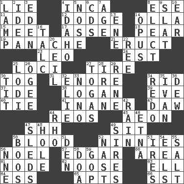 ACROSS 1. Untruth 4. South American Indian 8. Compass dir. 11. Increase 12. Evade 14. Rounded earthenware pot or jar 15. Confront 17. NE Netherlands city 18. Lightbulb-shaped fruit 19. Flamboyance 21. Spew [out] 23. Lion 24. Eastern Standard Time (abbr.) 25. Locales 27. Hoop that covers a wheel 30. Coat; cloak 31. Poe poem 34. To free from 37. Binary compound 38. Utah city north of Ogden 39. Night before a holiday 40. Standoff 41. More lacking in sense or substance 43. Obsolete 44. Vintage cars 45. Age 47. Quiet! 49. Be seated 50. Vital fluid 52. Fools 56. Christmas carol 57. _ Allan Poe 60. Type of rug 61. Connecting point 62. Trap for birds or small mammals 63. Pipe bend 64. Double-curved letter 65. Flats, for short 66. Fast jet (abbr.) DOWN 1. Desk light 2. The main thing one is thinking about 3. Locale of original sin 4. Potato state 5. Characteristic smell of wine 6. Music discs 7. Personal question 8. Voters do this 9. Narrow board 10. Ewer handle 13. Compass dir. 14. Musical composition 16. Baby powder 20. To provide with a ceiling 22. To riddle 25. Farming town in central California 26. Double curve, resembling the letter S 27. Ancient Roman robes 28. SW Asia republic 29. French philosopher Descartes 30. Teat (slang) 32. Writer Wiesel 33. Words to Nanette 34. Redecorate 35. _ the terrible 36. Morning condensation 42. Precipitation 44. 17th letter of the Greek alphabet 46. Inactive volcano in Sicily 47. Bobsleighs 48. Opening into or through something 49. Male parents of animals 50. Scornful sounds 51. Lair 52. Political cartoonist Thomas 53. Angers 54. Snakelike fish 55. Table seasoning 56. Compass dir. 58. ___ good deed 59. Republican Party